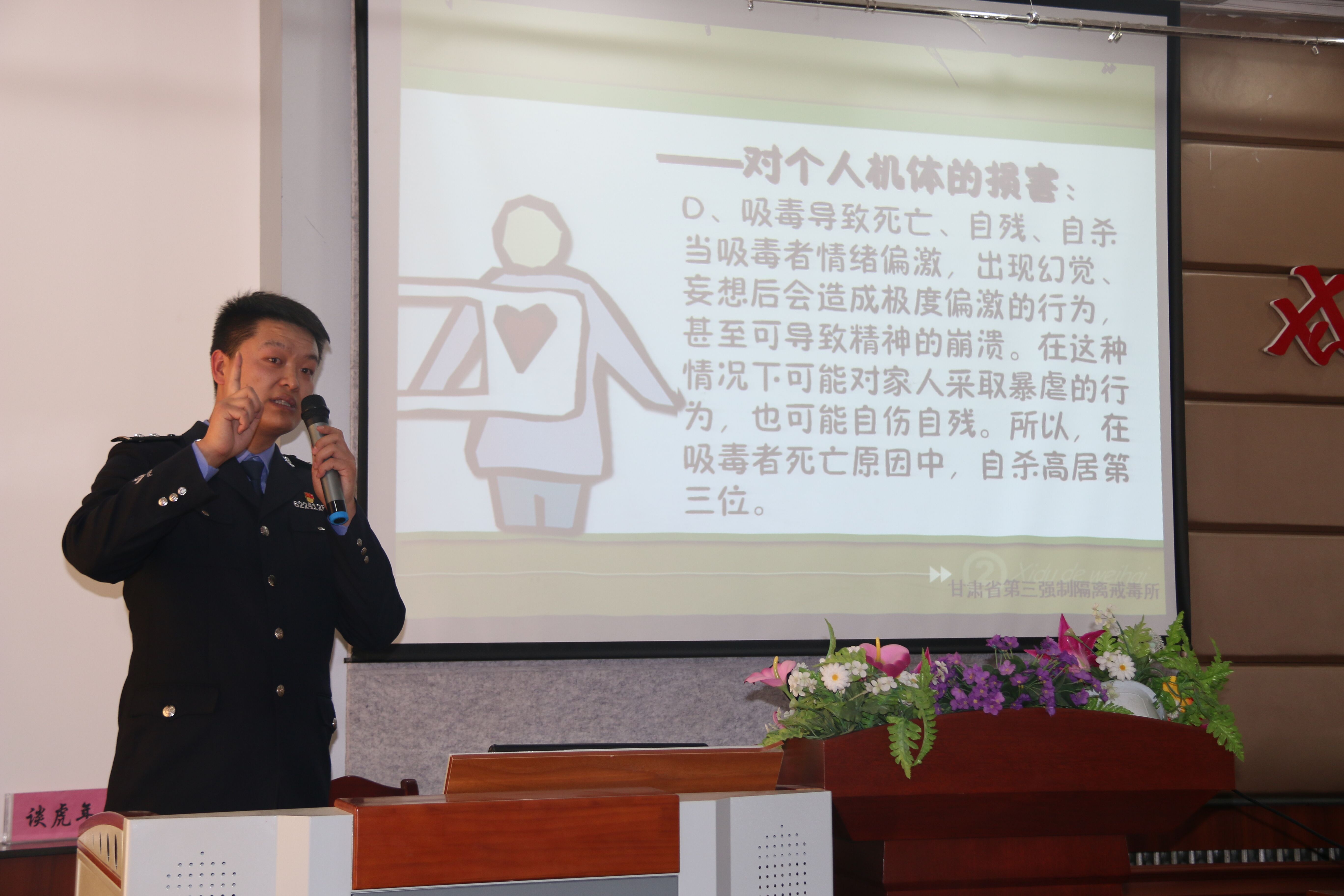 活動現場,省第三強制隔離戒毒所三大隊副教導員顧禮用通俗易懂、風趣幽默的語言從毒品常識、吸毒的危害、青少年吸毒的原因、珍愛生命,拒絕毒品、禁毒法律法規等問題作了深入淺出的講解。告誡學生遠離毒品,自覺抵制毒品,樹立自我保護意識。