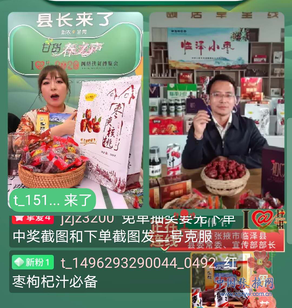 中國張掖網(wǎng)臨澤訊 4月15日,甘肅省委網(wǎng)信辦舉辦“I@甘肅2020網(wǎng)絡扶貧博覽會”網(wǎng)絡直播活動,臨澤小棗、棗夾核桃、紅棗枸杞汁、紅棗原漿、紅棗雞蛋干、焦棗茶和桑葚紅棗濃縮原漿等7款優(yōu)質(zhì)棗產(chǎn)品參加此次直播促銷活動,共同助力脫貧攻堅。