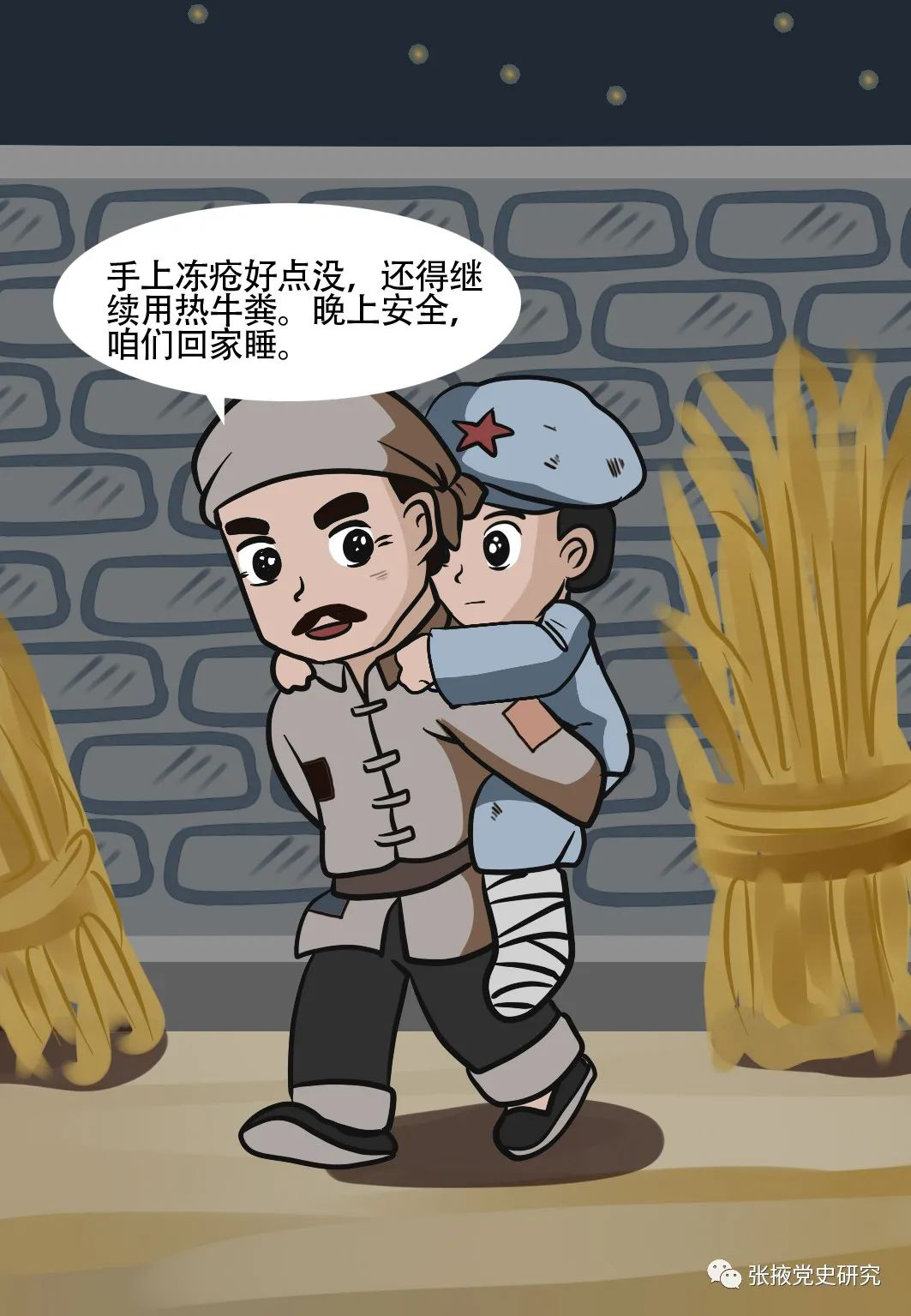 這個(gè)小紅軍名叫唐金云,是紅軍部隊(duì)中的理發(fā)員,掉隊(duì)流落時(shí)僅有15歲。楊秀清老人讓唐金云去找個(gè)地方躲起來(lái),免得再遭不測(cè)。同村周丕國(guó)看唐金云手腳凍傷不能繼續(xù)行走,加之馬匪當(dāng)時(shí)大肆搜查,全村人誰(shuí)都不敢收留。周丕國(guó)冒著犧牲一家人性命的危險(xiǎn)主動(dòng)把唐金云領(lǐng)回自己家里,并讓他吃完飯后和他一起睡在熱炕上。