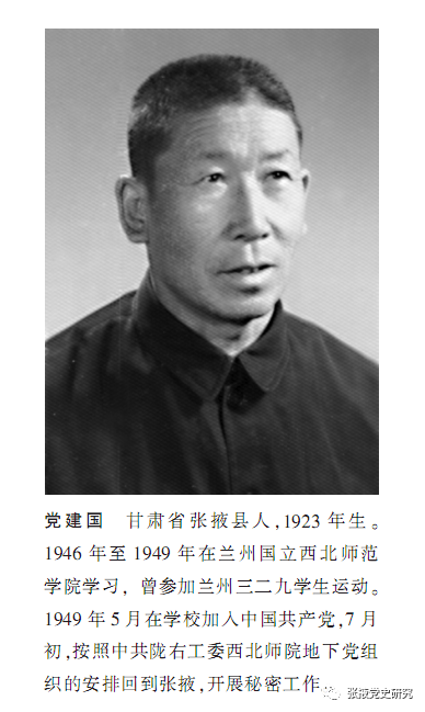 8月初,西北師范學院學生、中共黨員趙敦生利用公務之便從武威到張掖會見黨建國,并留下一本黨章供指導工作之用。同時向黨建國介紹他在國民黨張掖縣政府工作的老鄉王國鈺,已具備黨員條件,可接收入黨,以便通報政界情況。黨建國找到王國鈺,經考察接收王國鈺入黨。之后,通過深入細致的工作,先后在張掖中學接收馬英,在王國森家中接收姜文謂、談奮家、楊士林,在文廟接收陳新鳴、蔡士奎,在拒敵堡接收樊桁,在甘浚堡接收安有謨等人入黨。至9月19日張掖縣解放,黨建國先后在張掖秘密發展中共黨員12名。