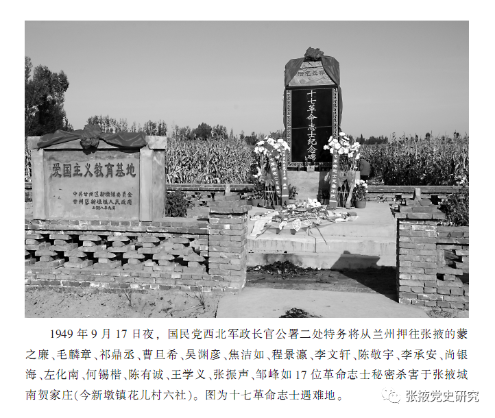 1949年8月,中國人民解放軍向蘭州進軍,國民黨西北軍政長官公署和駐守蘭州的國民黨軍隊垂死掙扎,鎮壓各地反暴政、迎黎明斗爭,搜捕、殘害革命人士。8月中旬,解放大軍兵臨蘭州,國民黨西北軍政長官公署第二處將蘭州廣武路秘密監獄關押的30余名革命志士押往張掖。9月17日深夜,其中17位革命志士在張掖城南賀家莊(今新墩鎮花兒村六社)被國民黨特務和自衛隊殺害。十七位革命志士是:蒙之廉,甘肅通渭人,中共黨員,隴右游擊隊員,通渭榜羅鎮鎮長;毛麟章,甘肅通渭人,中共黨員,隴右游擊隊員;焦潔如,河南洛陽人,蘭州大學俄文系學生,進步青年;陳敬宇,河南偃城人,蘭州大學法律系學生,進步青年;李承安,河南鞏縣人,蘭州大學法律系學生,進步青年;張振聲,甘肅永登人,國民黨247師中尉排長;曹旦希,湖南長沙人,甘肅郵政局郵務工會理事長;祁鼎丞,甘肅固原人,民盟成員,國民黨甘肅省參議員,進步人士;吳淵彥,安徽宣城人,蘭州萬國寄售商行經理,進步人士;李文軒,甘肅涇川人,農民,進步人士;尚銀海,陜西長武人,商人,進步人士;左化南,四川重慶人,流落紅軍,天水團管區新兵大隊軍士;何錫楷,四川人,皮匠,進步人士;陳有誠,江西人,農民,寄居岷縣,進步人士;王學義,甘肅文縣人,蘭州大學學生,進步青年;鄒峰如,陜西邠縣人,邠縣軍事科長,進步人士;程景瀛,甘肅文縣人,蘭州工校職員,進步青年。