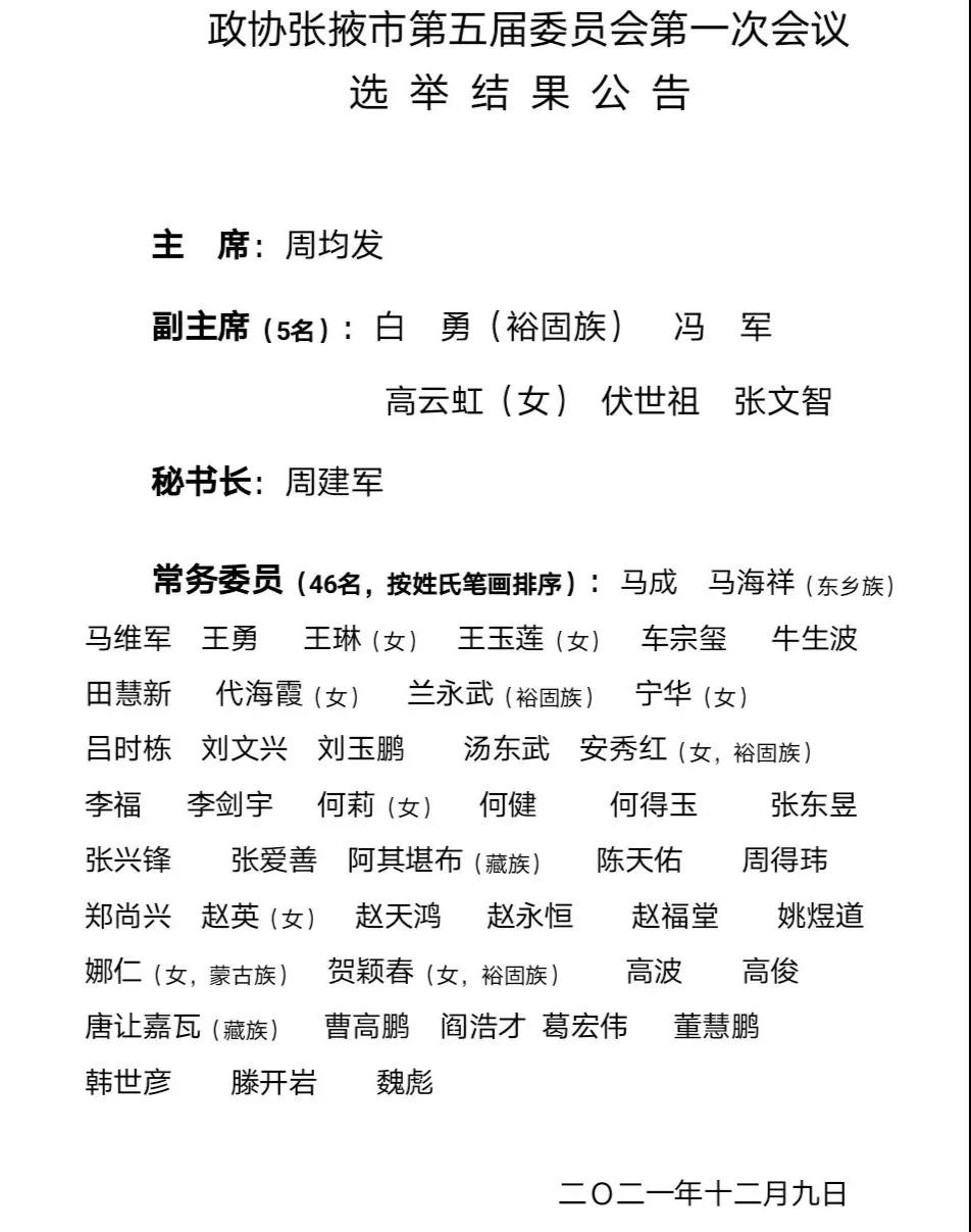 【聚焦張掖兩會】政協張掖市第五屆委員會第一次會議選舉結果公告