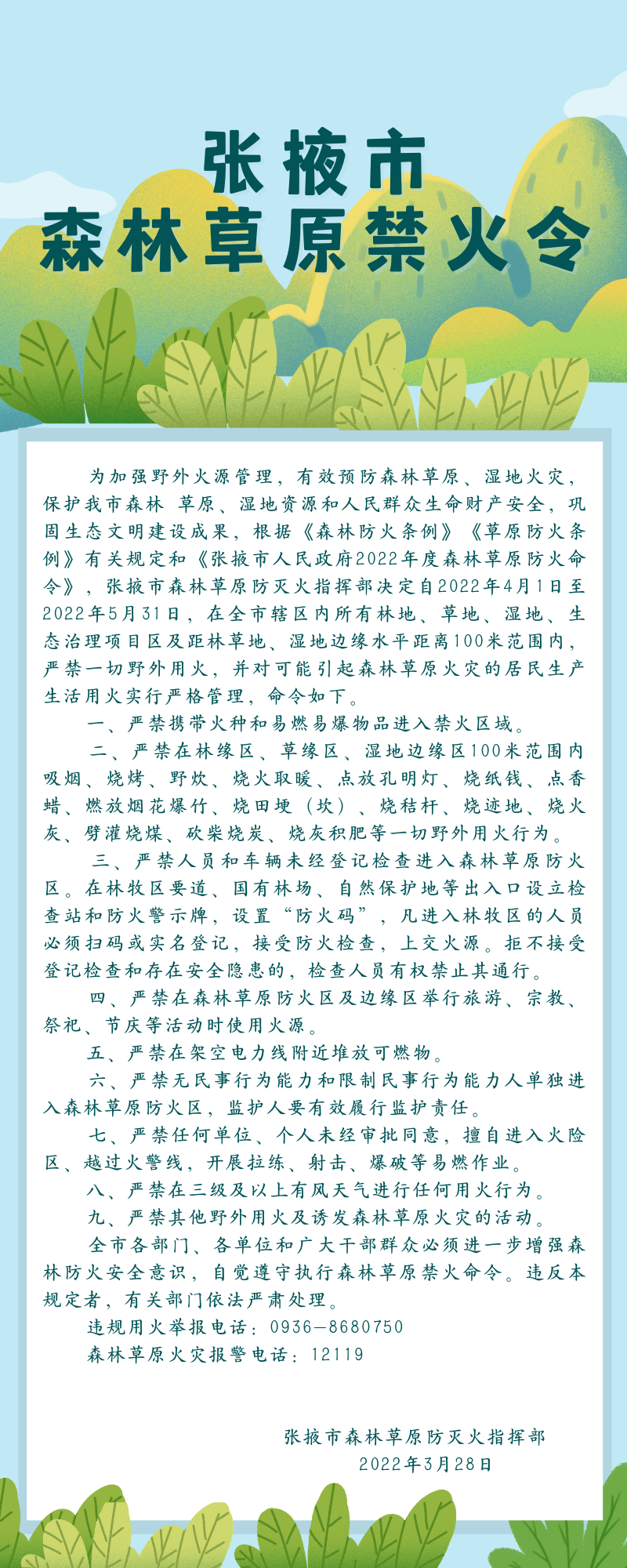為加強野外火源管理,有效預防森林草原、濕地火災,保護我市森林草原、濕地資源和人民群眾生命財產安全,鞏固生態文明建設成果,根據《森林防火條例》《草原防火條例》有關規定和《張掖市人民政府2022年度森林草原防火命令》,張掖市森林草原防滅火指揮部決定自2022年4月1日至2022年5月31日,在全市轄區內所有林地、草地、濕地、生態治理項目區及距林草地、濕地邊緣水平距離100米范圍內,嚴禁一切野外用火,并對可能引起森林草原火災的居民生產生活用火實行嚴格管理,命令如下。