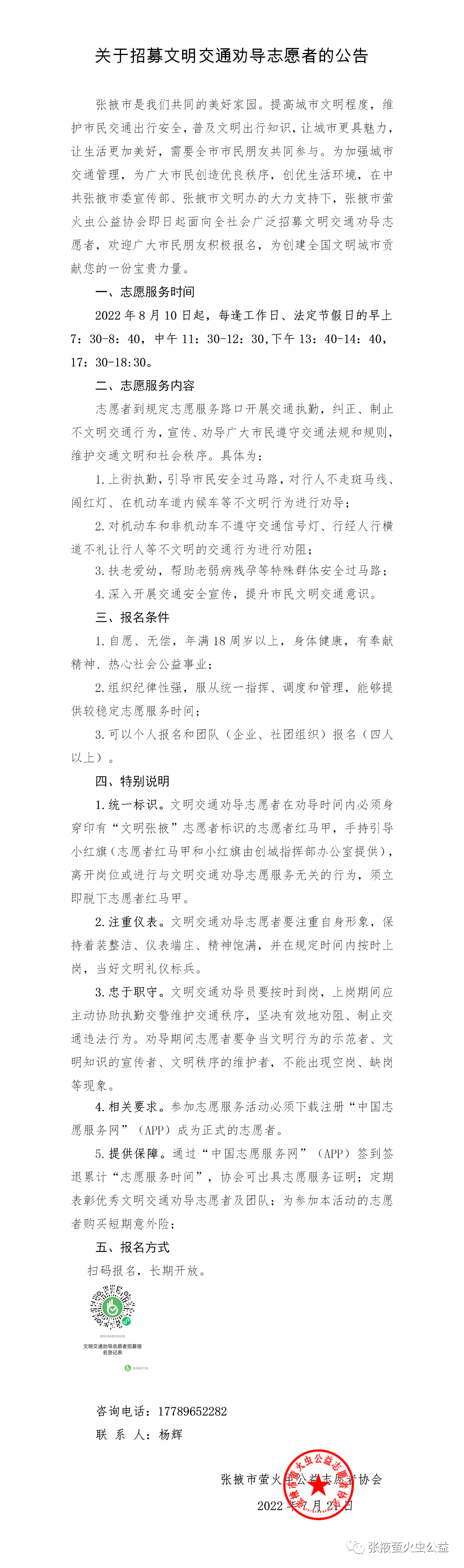 張掖是我們共同的美好家園。提高城市文明程度,維護市民交通出行安全,普及文明出行知識,讓城市更具魅力,讓生活更加美好,需要全市市民朋友共同參與。為加強城市交通管理,為廣大市民創造優良秩序,創優生活環境,在中共張掖市委宣傳部、張掖市文明辦的大力支持下,張掖市螢火蟲公益協會即日起面向全社會廣泛招募文明交通勸導志愿者,歡迎廣大市民朋友積極報名,為創建全國文明城市貢獻您的一份寶貴力量。
