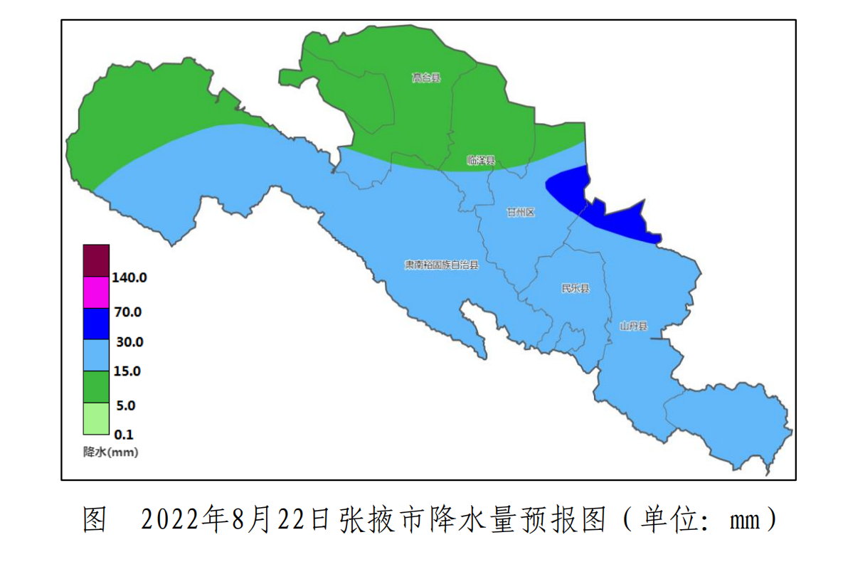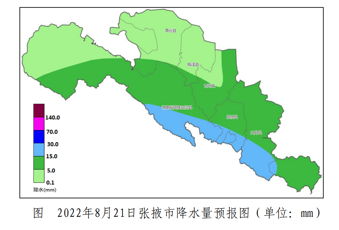 8月21日:甘州、高臺、臨澤小到中雨,山丹、民樂、肅南中到大雨;西北風4-5級;氣溫:川區14℃~22℃,山區12℃~16℃。