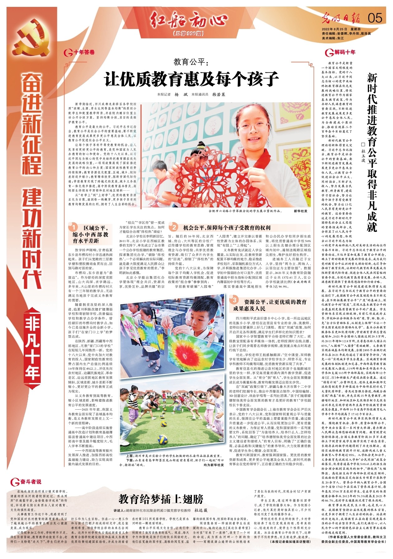 讓每個孩子享有平等受教育的機會,讓人民享有更好更公平的教育,是黨和國家為人民辦教育的初心和使命。黨的十八大以來,以習近平同志為核心的黨中央始終把教育擺在優先發展的戰略位置,一項項政策展現了國家推進教育公平的決心和力度:國家財政性教育經費持續保障;教育資源優化配置,區域、城鄉、校際差距逐步縮小;教育精準扶貧,阻斷貧困代際傳遞;學前教育實現了跨越式的發展,城鄉義務教育一體化穩步推進,高中階段教育基本普及,高校招生持續向中西部和農村地區傾斜……