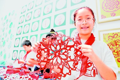 合肥市六安路小學翠微分校的學生展示剪紙作品。新華社發