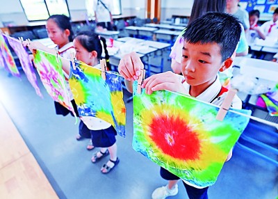 湖州市吳興實驗小學的學生把做好的扎染作品掛在教室里。新華社發