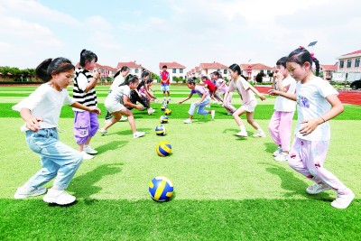 山東省青島市即墨區龍山街道前東葛村,孩子們一起玩“聽口令、搶排球”游戲。新華社發