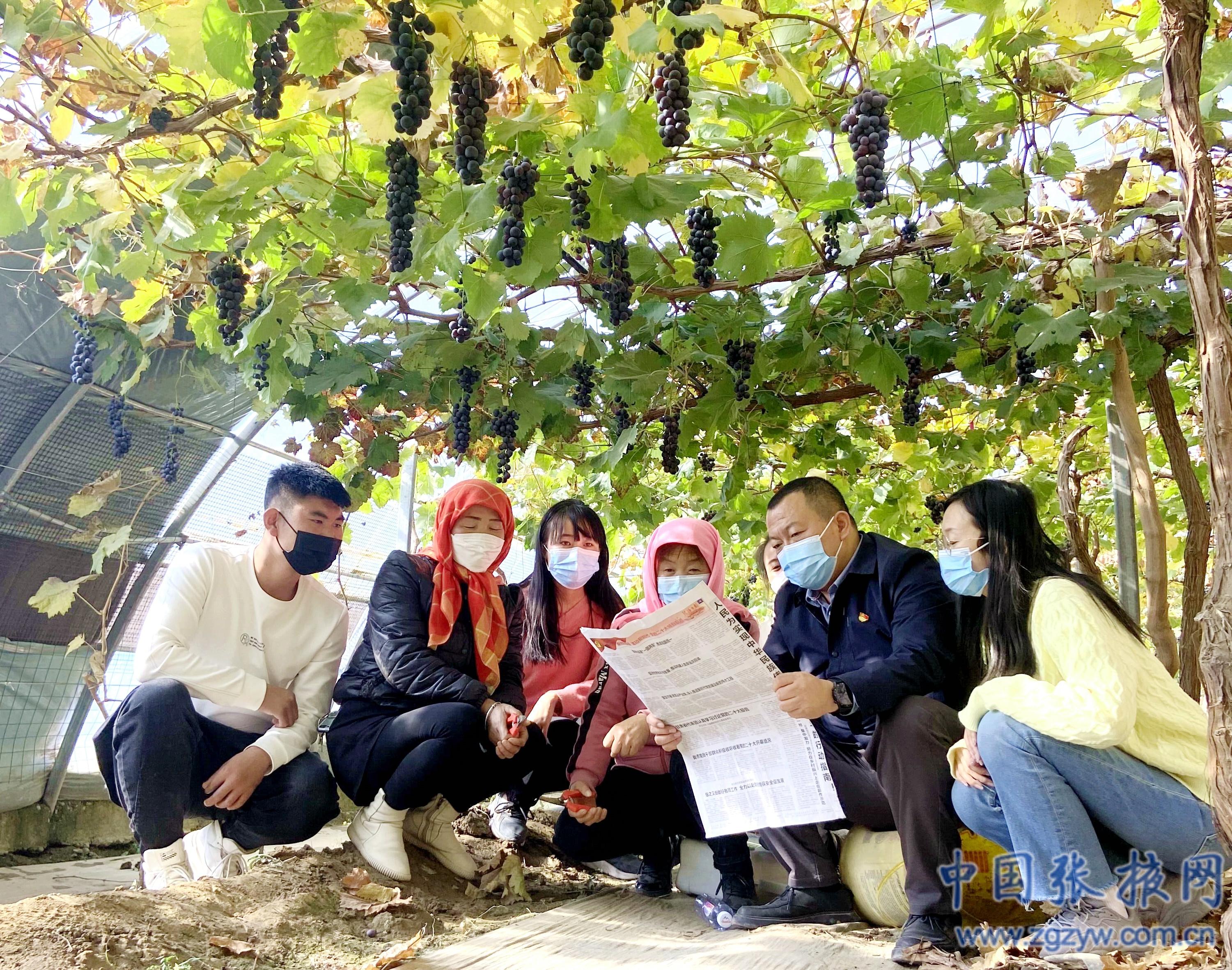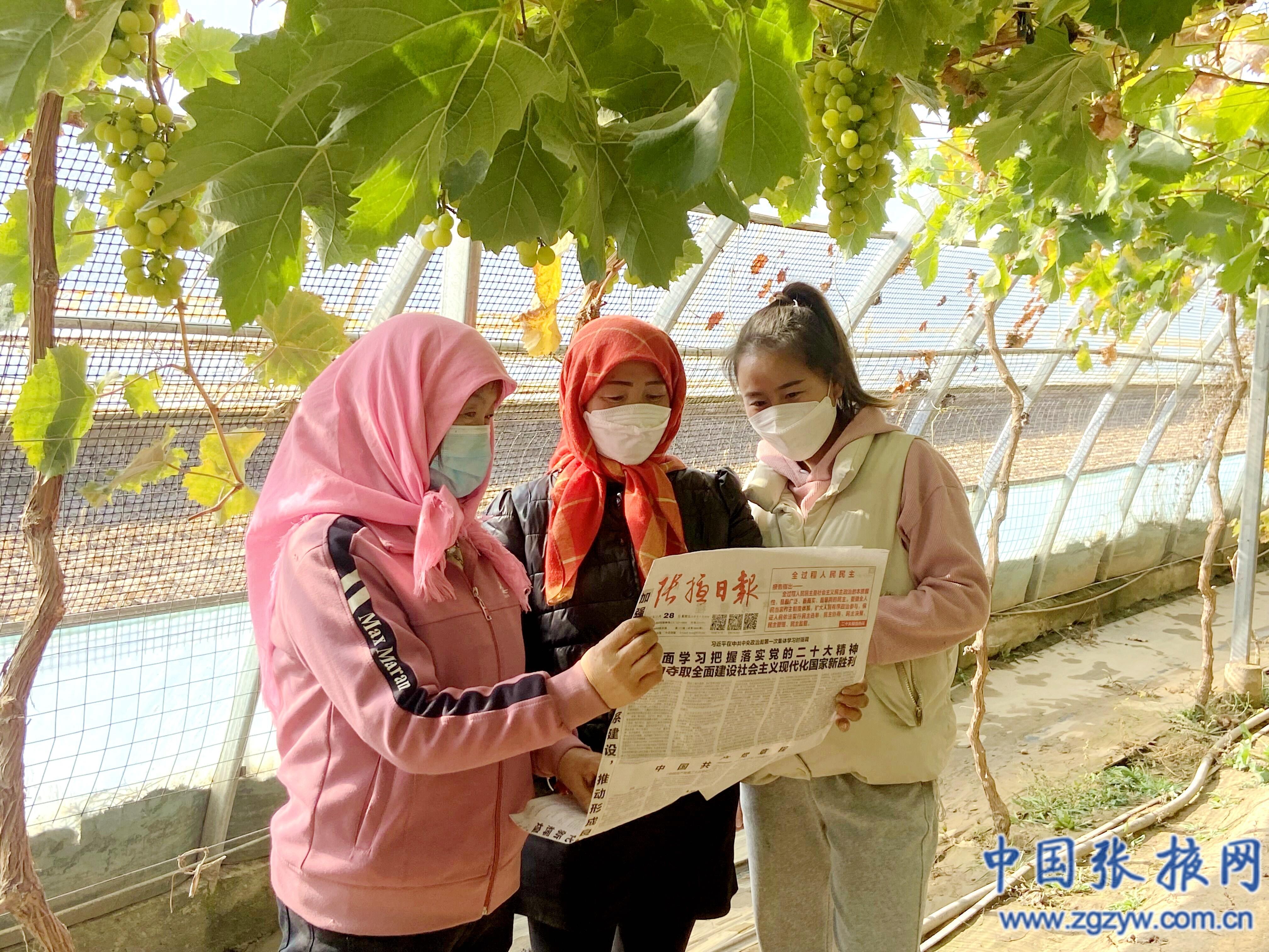 中國張掖網甘州訊 “黨的二十大報告中提出,要‘全面推進鄉村振興。堅持農業農村優先發展,堅持城鄉融合發展,暢通城鄉要素流動。扎實推動鄉村產業、人才、文化、生態、組織振興?!覀円劳鞋F有的高端品系葡萄產業發展基礎,進一步延伸紅色產業鏈條,持續放大農旅產品品牌效應,努力推動全村在新的趕考之路上實現更高質量發展?!?1月1日上午,甘州區龍渠鄉副鄉長張森同志在墩源村葡萄產業園里,用鮮活的故事、生動的例子、接地氣的話語為群眾宣講黨的二十大精神。