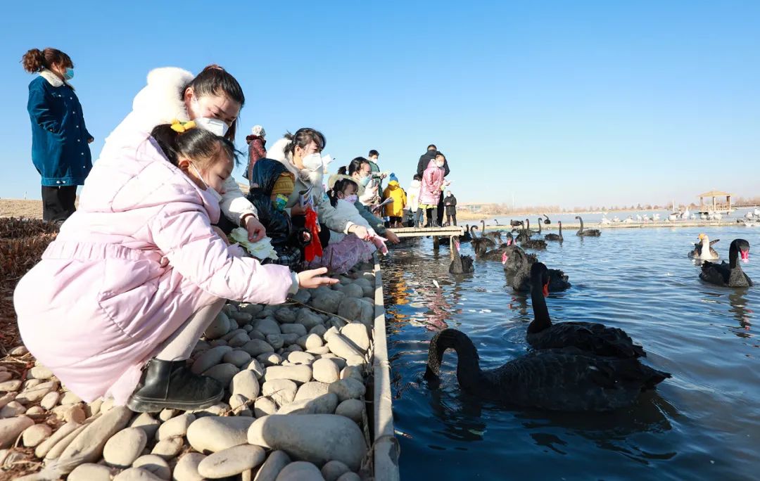 張掖國家濕地公園里,帶著小孩前來觀光的市民絡繹不絕。在該園鶴影湖和如意湖旁,游客們帶著小袋鳥食,進行人工投喂,吸引了很多候鳥前來覓食。如意湖是該公園內最大的候鳥遷徙區,每年的十一月至來年的三月中旬有大批候鳥在此停留,這里也成了候鳥遷徙重要的“中轉站”、“加油站”,廣大游客可以欣賞到候鳥漫天舞的盛景。“家長與孩子不但通過專業設備親眼看到了許多珍稀鳥類,認識到了鳥類之美,而且學習到了許多一手的護鳥知識,提升了保護環境保護野生動物的意識。”濕地公園工作人員張小艷介紹說,元旦小長假策劃舉辦“觀”愛鳥類親近自然活動,得到了很多家長和小朋友的青睞。