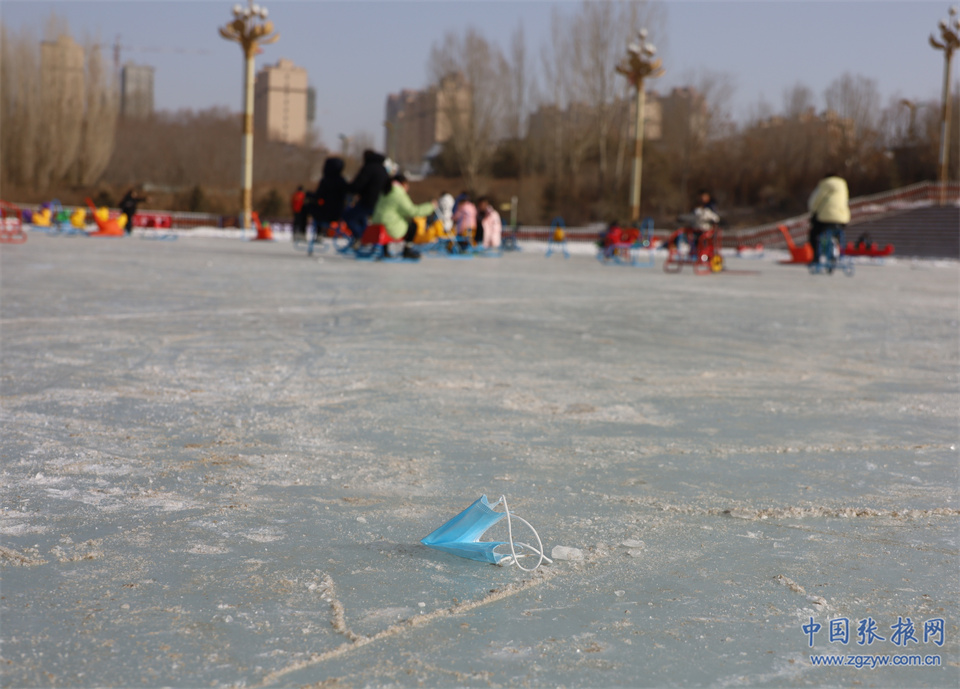 甘州區(qū)濱湖廣場滑雪場環(huán)境干凈整潔,游客有序欣賞美景、快樂游玩,附近地面和冰面上有一些垃圾,格外顯眼。