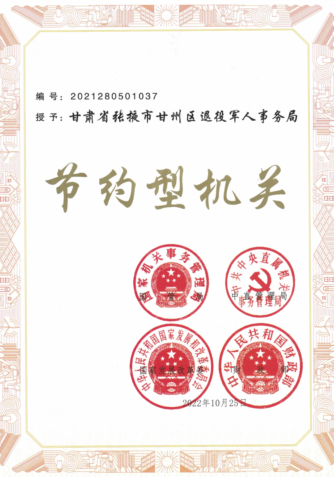 近日,甘州區退役軍人事務局被國家機關事務管理局、中共中央直屬機關事務管理局、國家發展和改革委員會、財政部授予“節約型機關”榮譽稱號。