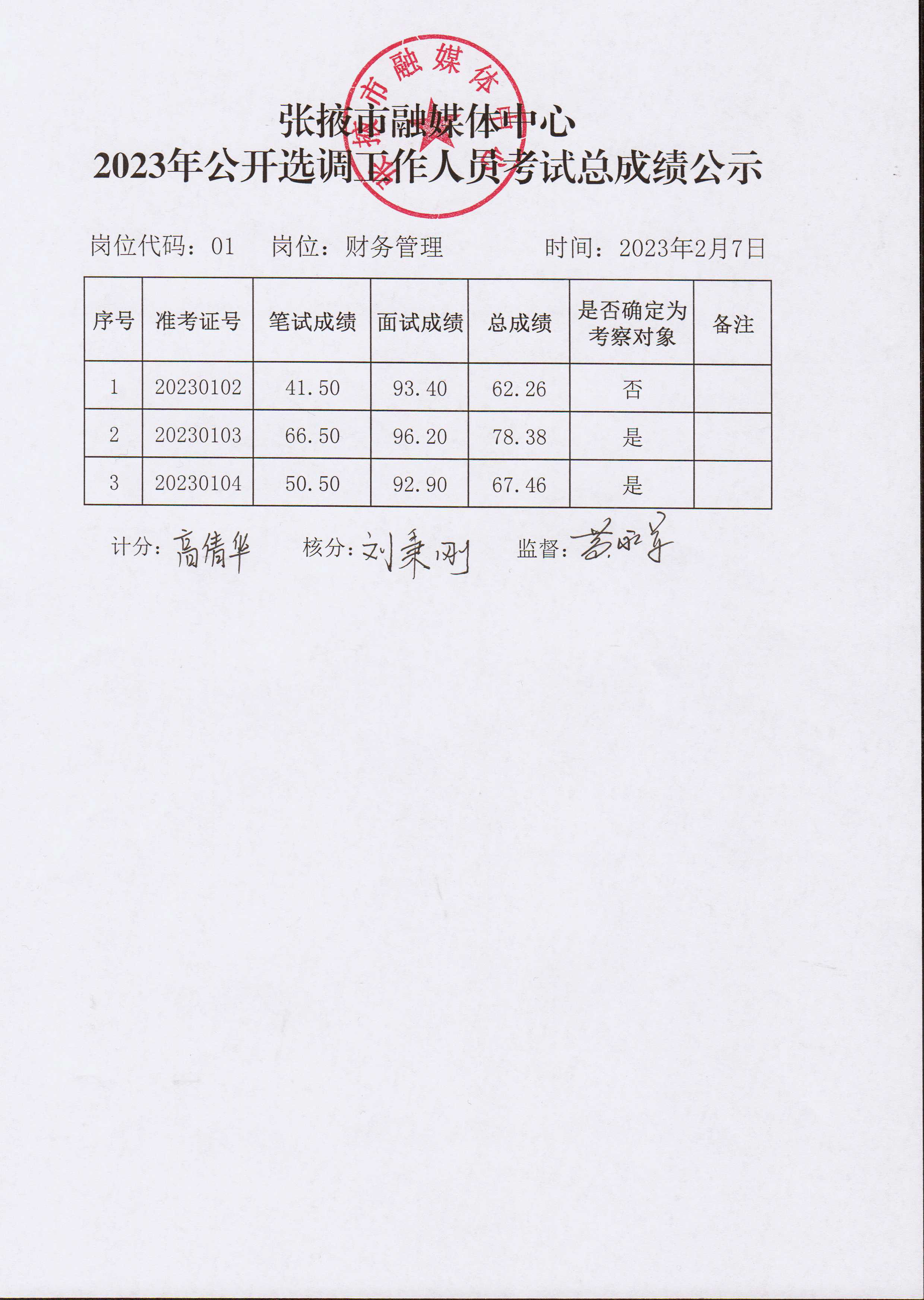 張掖市融媒體中心2023年公開選調工作人員面試成績公示