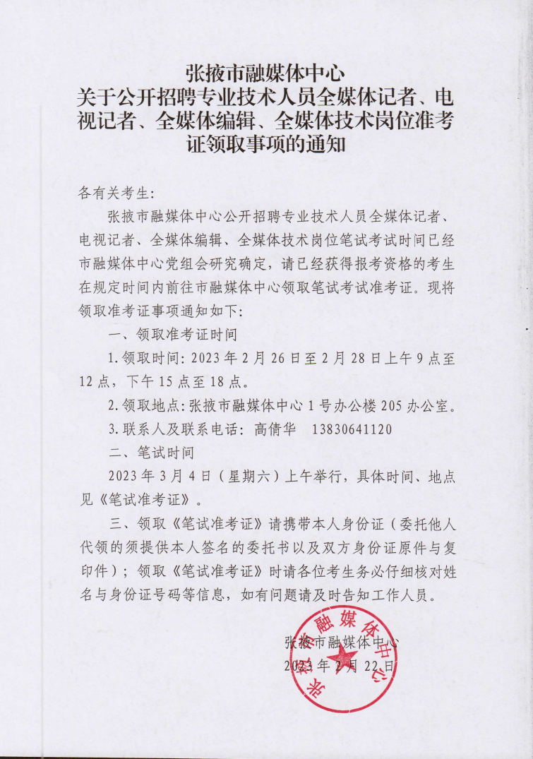 張掖市融媒體中心關(guān)于公開招聘專業(yè)技術(shù)人員全媒體記者、電視記者、全媒體編輯、全媒體技術(shù)崗位準考證領(lǐng)取事項的通知