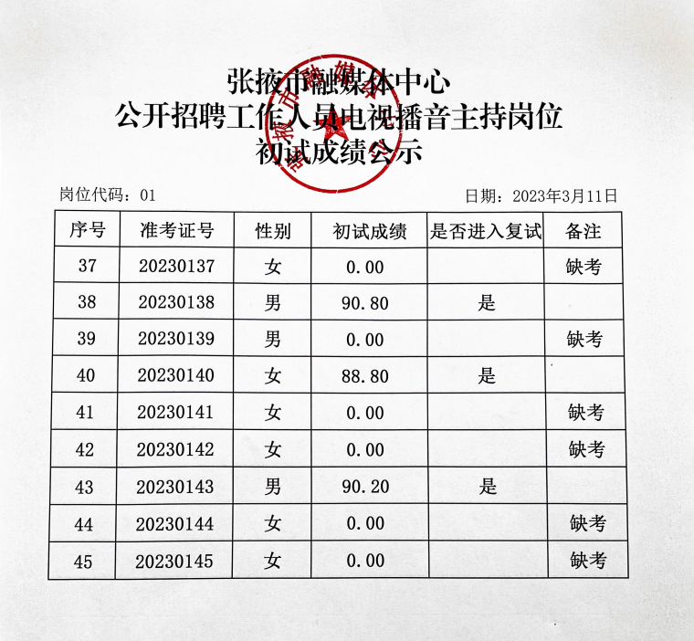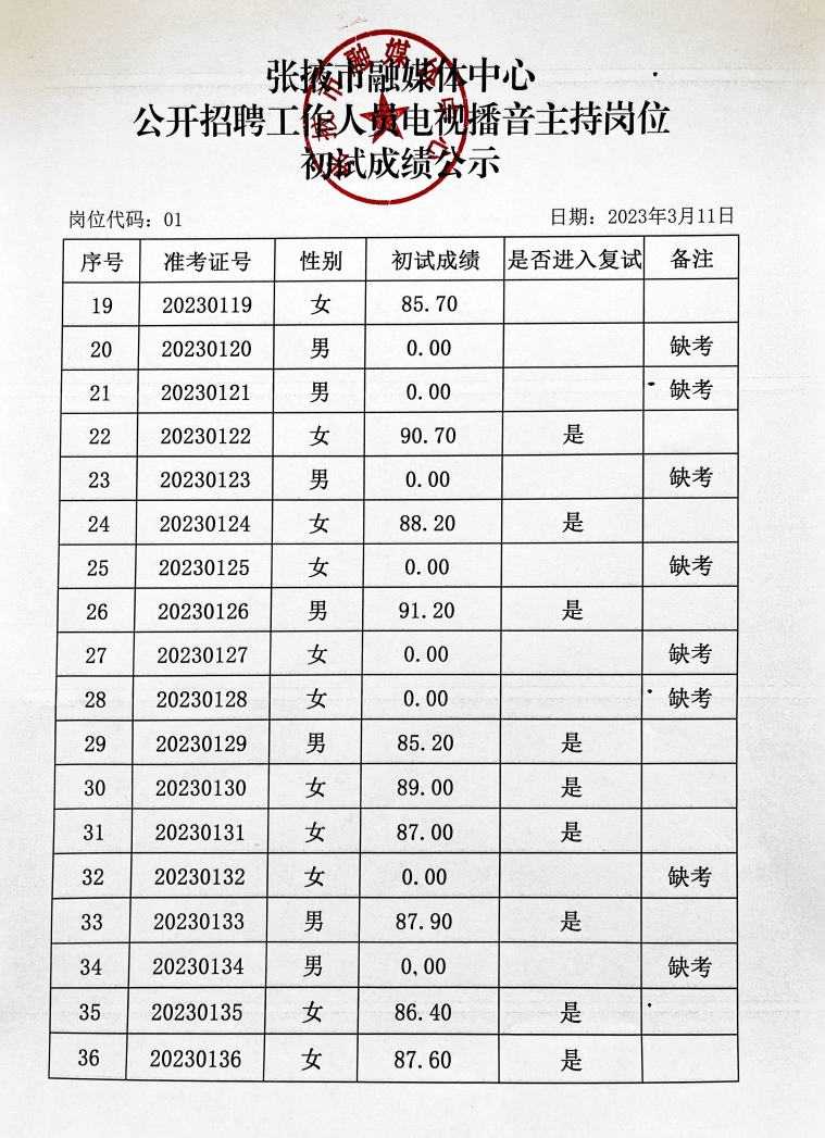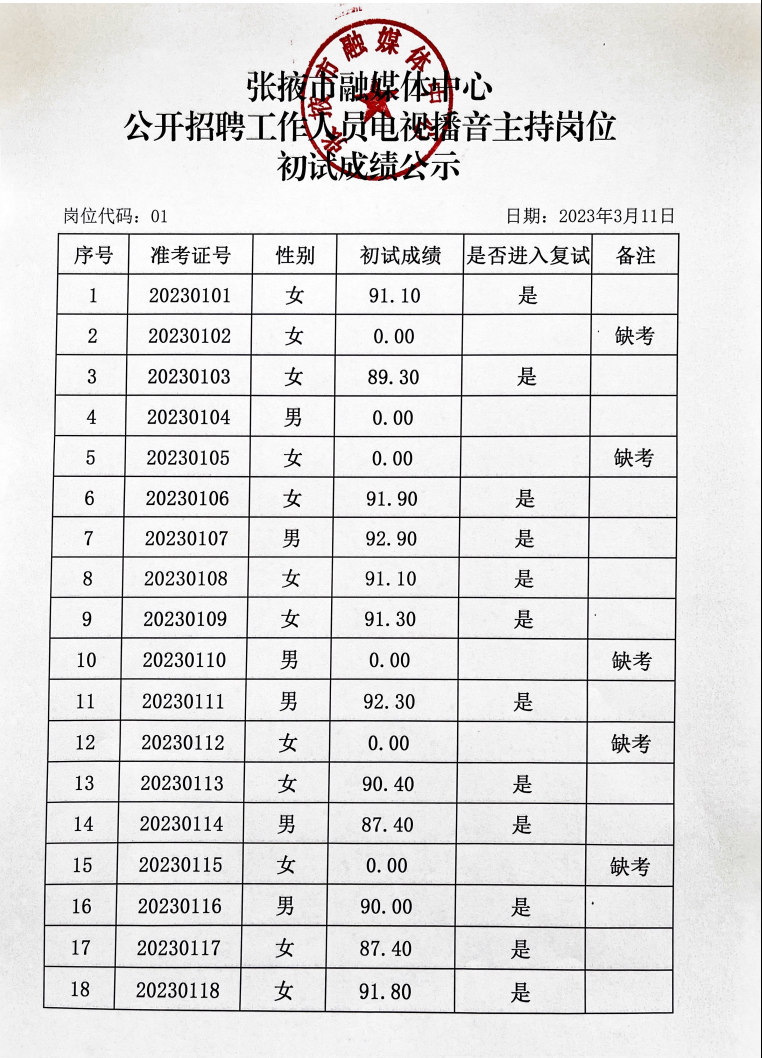 張掖市融媒體中心公開招聘工作人員筆試成績公示