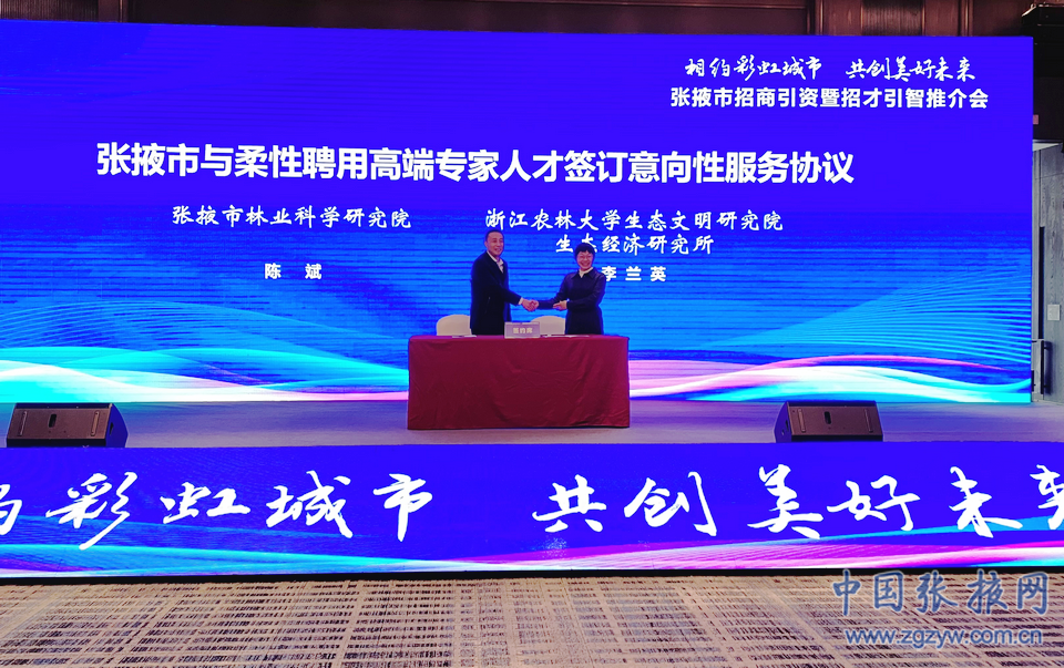 中國張掖網訊 為認真貫徹落實市委、市政府柔性引進高端人才工作部署要求,招引更多高端人才來我市工作,3月21日上午,在張掖市招商引資暨招才引智推介會上,市林科院與浙江農林大學生態文明研究院、碳中和研究院生態經濟研究所所長李蘭英教授成功簽訂柔性引進高端人才服務協議。