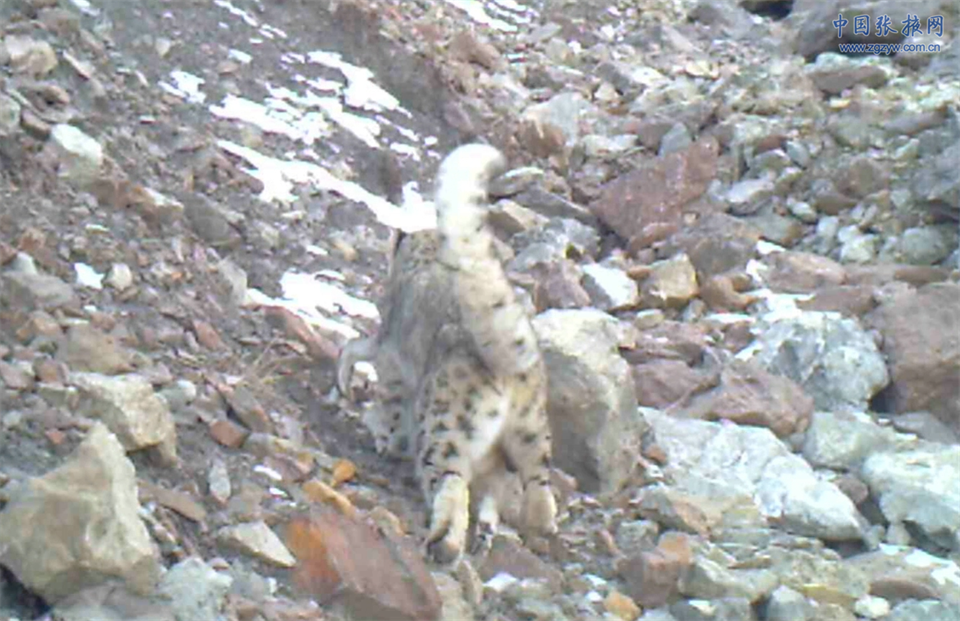 中國張掖網民樂訊 近日,在張掖市民樂縣境內的海潮壩附近,祁連山國家公園甘肅省管理局張掖分局大河口保護站管護員通過架設的紅外相機記錄到了一只雪豹捕食巖羊影像。