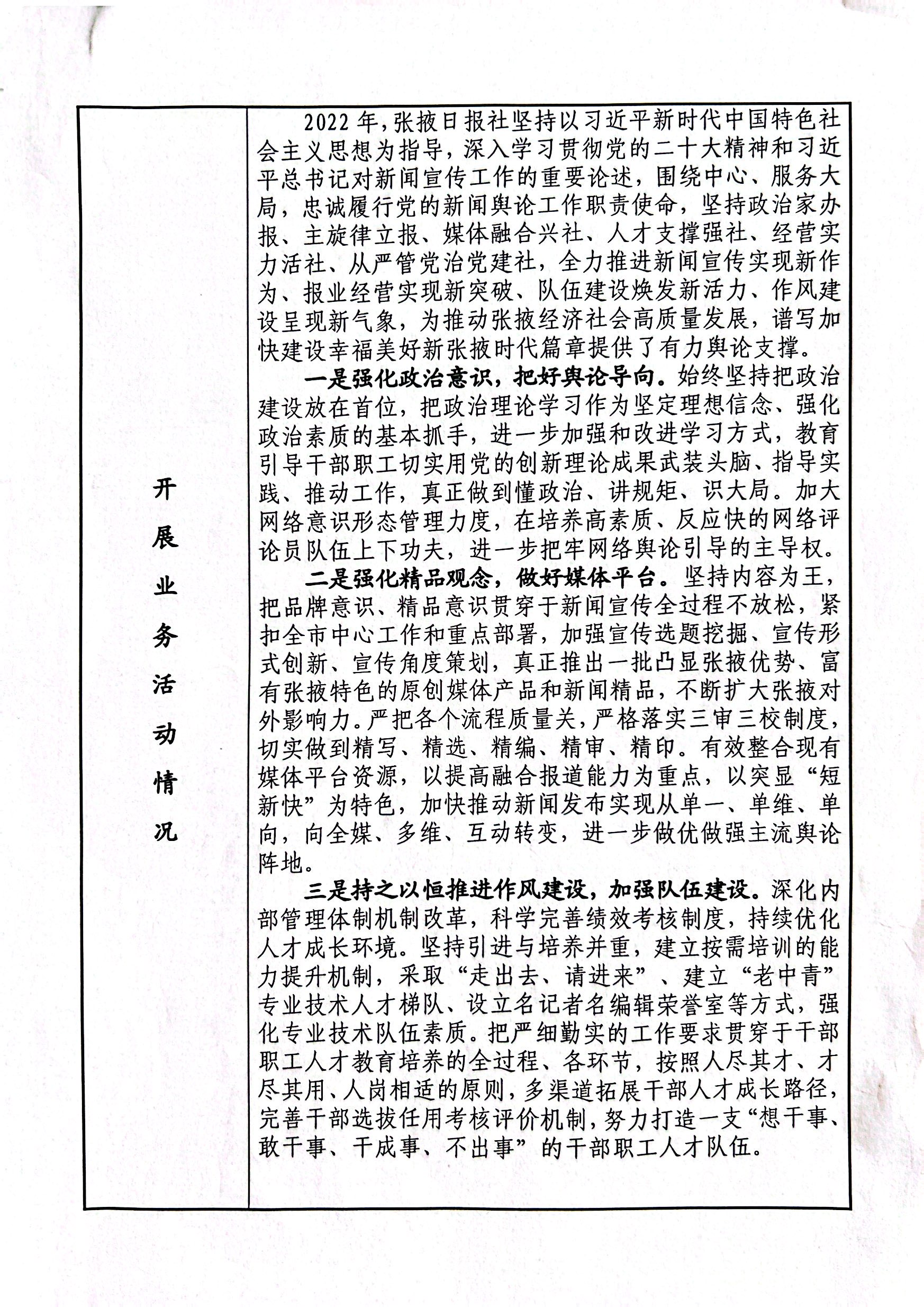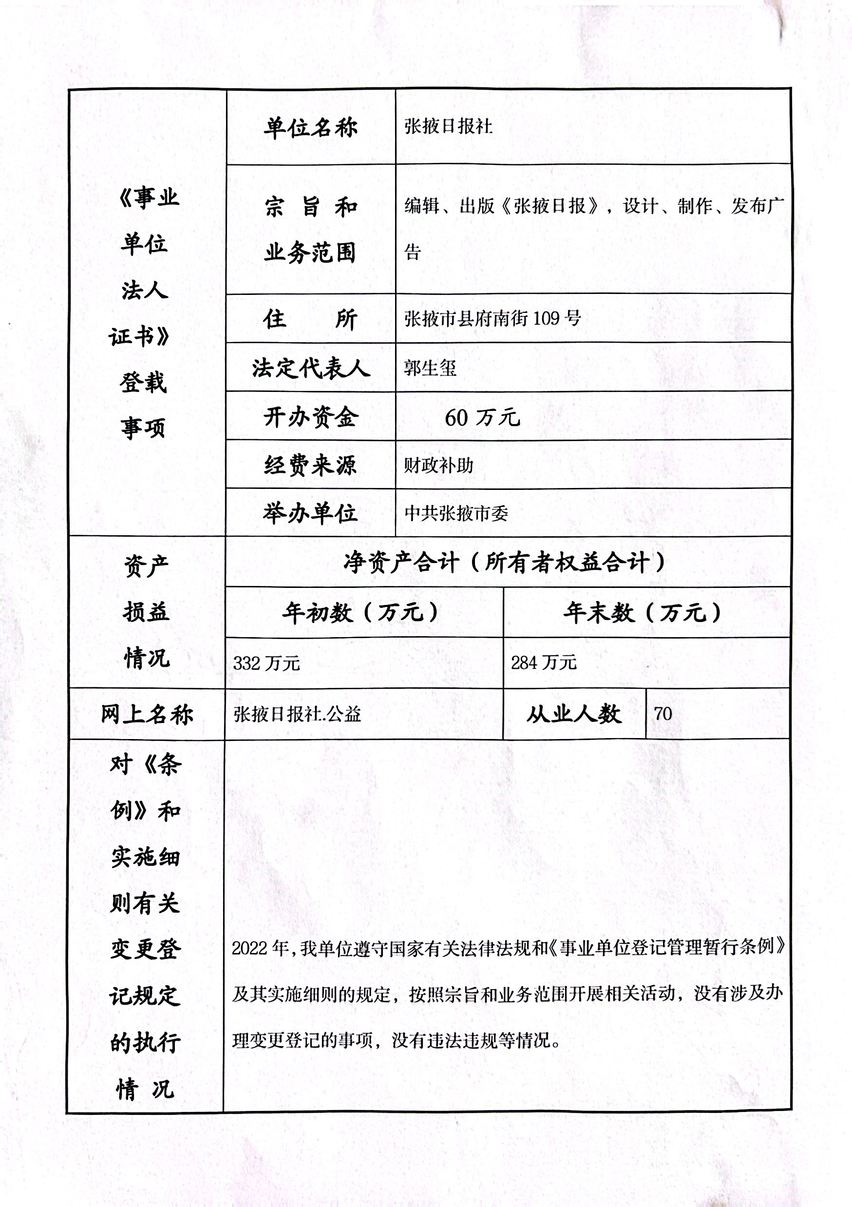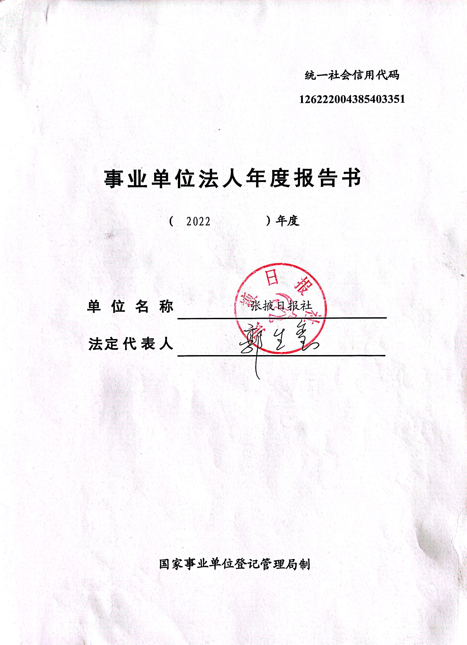 您當前的位置 : 中國張掖網 >> 問政 >> 公告 張掖日報社2022年度法人年度報告書 來源:張掖市融媒體中心 0 人參與互動 2023年03月28日 15:25