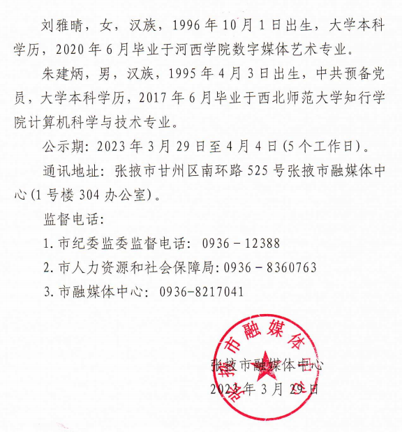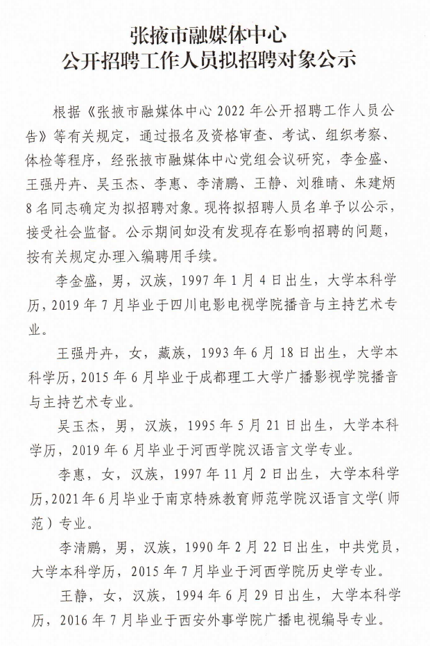 張掖市融媒體中心公開招聘工作人員擬招聘對象公示