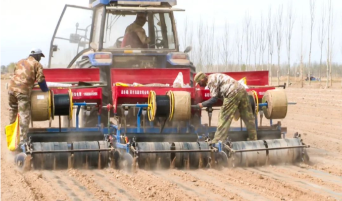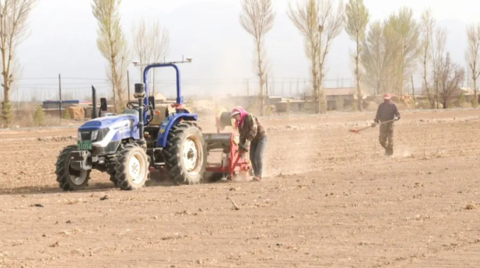 記者在宣化鎮利豐村的農田看到,多臺農機分工協作、大顯身手,一派熱鬧景象。伴隨著轟鳴聲,耕地機將肥沃的土壤均勻翻起;小型挖掘機負責為播種機運送肥料、農膜等物資;施肥播種機徐徐前進,所過之處一次性完成開溝、施肥、鋪設滴灌帶、覆土等工序。“我們這3500畝地全靠這8臺機械,從犁地、旋地、打藥、鋪膜一體化服務,預計周期在一個月左右。”甘霖植保病蟲防治農民專業合作社經理李鑫說。