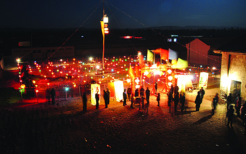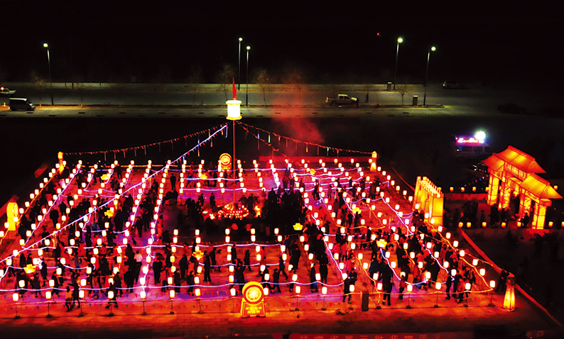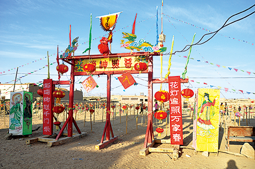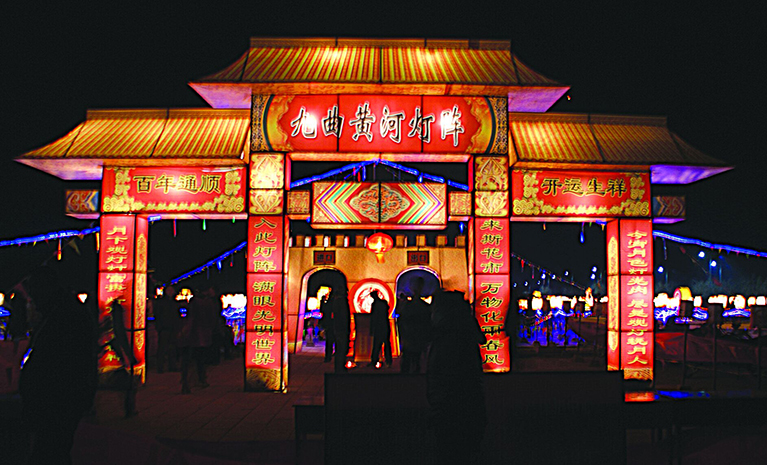 高臺黃河燈陣全稱為“九宮八卦黃河陣”,又叫“九曲黃河陣”或“燈桿會”。自明清以來,高臺縣較大的堡子每年正月十三到正月十六都有黃河燈陣,主要是為了當地百姓求吉祥求平安,寄托美好祝愿。從正月十一日就開始著手準備,并且這一天在燈場中心立一根高8米的木柱,稱之為“立大桅”。在“大桅”的頂端高掛“混元金斗”燈,掛一塊6.4米長的黃布,稱“杏黃大旗”,在大桅下面設置中央祭臺,擺放趙公明(財神爺)畫像或塑像,放置香爐、香表之類,擺一功德箱,設一中堂,有燈官坐堂,兩班衙役(當地群眾扮演)跟隨,人們在此祈求幸福安康、五谷豐登。在祈福時,要跪拜燈官老爺,燈官老爺口念祝頌語,賜福于跪拜者;然后由兩班衙役手持水火棍在跪拜者身上輕輕擊打,同齡熟人之間故意打得較重,以逗笑取樂,同時口念“一打國泰民安,二打風調雨順,三打長命百歲,四打大吉大利”等祝福語。正月十三晚上,在大桅四周按21行、21列呈正方形栽植木桿,并拔去中央9個,以留出中央祭臺的位置,木桿高1.2米,共432根,行距、株距視場地大小而定,用繩子將這些木桿連接起來,繩上粘貼彩紙小旗,形成一個迷宮般的燈陣。每個木桿頂端放一塊20厘米見方的小木板,小木板四周糊上15厘米寬的一圈彩紙,再貼上各種窗花圖案,叫作燈帽子。在燈帽子中心放一盞由面粉捏成的小油燈,添上清油,放上捻子。一般燈桿、燈帽、面燈都是本村老百姓自發捐來的,面燈都是蒸熟的。關于點花燈,還有一些傳統,即“正月十三是白燈,正月十四半場子燈,十五、十六是全燈”。具體做法是:正月十三晚上,只點燃中間大桅上的主燈和四角木柱上的幾盞燈;正月十四晚上,點燃中央主燈和八個方位上的一部分燈;正月十五、十六晚上點燃所有的燈。四角四燈柱高掛燈串,四周全用紅燈圍起,不得隨意入內,每陣中央設置黃色燈籠提示游人慢行。目前,高臺黃河燈陣主要在黑泉鄉鎮江村沿襲傳承。此外,合黎鄉五三村也有“卍”字燈陣,布陣方法有所不同,在四角及中央的木柱上分別書寫“東方甲乙木星之神位、南方丙丁火星之神位、中央戊己土星之神位、西方庚辛金星之神位、北方壬癸水星之神位”。在該縣黑泉鄉定平村(原稱大寧堡)堡內西北角原有一“燈架灣”,中立大桅常年不撤,因而得名。 2011年3月16日,高臺黃河燈陣被甘肅省人民政府列入第三批甘肅省非物質文化遺產代表性項目名錄。保護單位:張掖市高臺縣文化館。