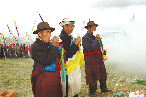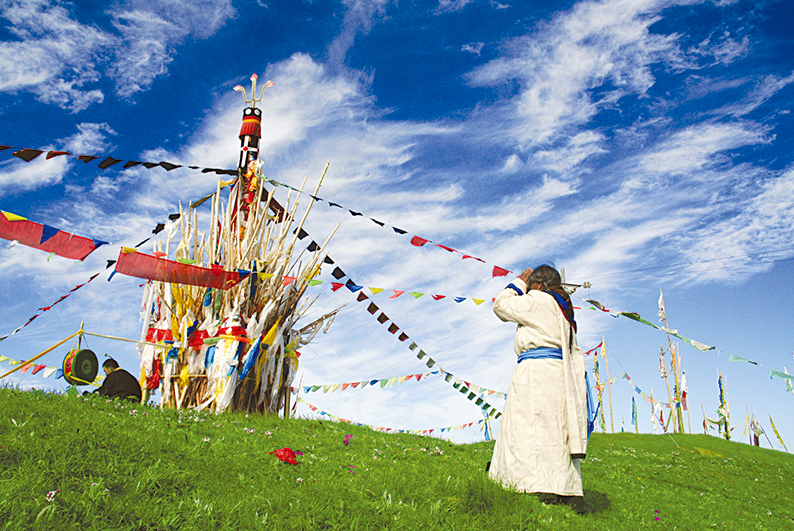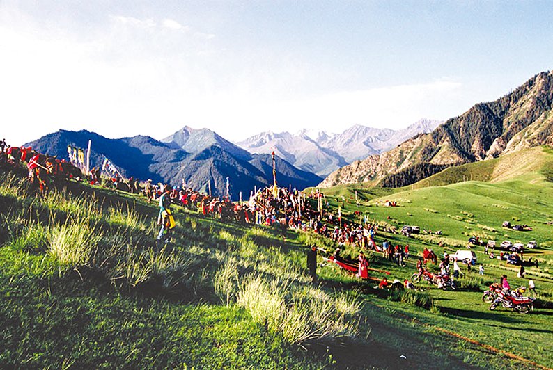 祭鄂博儀式是裕固族先民原始宗教信仰——薩滿教的一個重要儀式,歷史悠久,且隨裕固族發(fā)展變遷而不斷豐富。裕固族先民改信佛教后,祭鄂博儀式也隨之演變,成為兩種信仰的有機結合。祭鄂博形式為:在山頂、山岔、山坡或平坦地帶,用石頭壘一山包或方斗形的城堡,中間插上5—6米長的松木桿子,桿頭削尖染紅后,栓上各色羊毛繩、布條、哈達等,周圍也拉上羊毛繩,把印有經(jīng)文的哈達、布條拴在上面。祭祀這天,各家?guī)汤摇频燃榔穪淼蕉醪┣皡⒓蛹漓雰x式。每家每戶都要準備尖端纏有羊毛的新木桿,插在鄂博上,人們或徒步或騎馬圍繞鄂博轉圈,并灑上奶酪、燒酒等祭品,再在四周點火、燒香,請寺院僧人念經(jīng)。然后,將一只專門喂養(yǎng)、從未剪過羊毛的“神羊”牽出,在“神羊”右肩上拴上紅、綠布條,頭上抹些酥油,再朝頭、背處澆水,當“神羊”全身顫抖時,宰殺祭獻鄂博,祈求它消災免難,保佑家家平安。祭畢,人們將羊背肉割下酬謝寺院僧人,余者由參加祭祀的人處理。祭鄂博每年進行一次,由寺院僧人選定時間,大致在農(nóng)歷六月份舉辦,也有在農(nóng)歷二月初二或四月二十一舉辦的。目前,肅南縣只有皇城、康樂、大河、祁豐等鄉(xiāng)鎮(zhèn)的極少部分村落有祭鄂博習俗,而且儀式越來越簡化,傳承人也呈現(xiàn)老齡化。祭鄂博儀式既反映了裕固族先民對日、月、雷、電和天的原始崇拜思想,也反映了由信仰薩滿教向信仰藏傳佛教的演變痕跡,對研究裕固族形成發(fā)展歷史、究西部民族文化交流,尤其是宗教文化的交流融合具有重要價值。 2008年6月13日,裕固族祭鄂博被甘肅省人民政府列入第二批甘肅省非物質文化遺產(chǎn)代表性項目名錄。保護單位:張掖市肅南縣裕固族文化研究室。