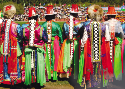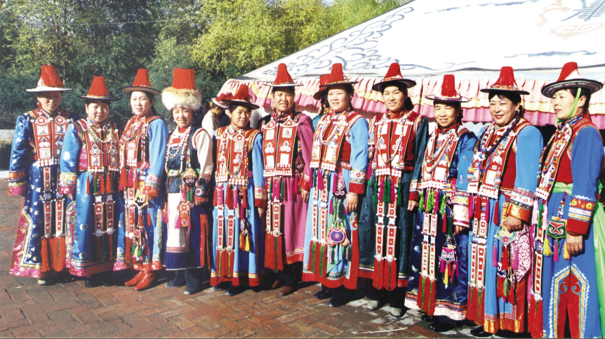 肅南裕固族自治縣位于甘肅省西北部河西走廊、祁連山北麓。全縣總面積2 . 38萬平方公里,是一個以裕固族為主體,藏、漢、蒙古、回、土等1 1個民族聚居的縣,人口3 . 58萬,其中裕固族是全國唯一、甘肅省獨有的人口較少民族之一。裕固族婦女有戴帽子習慣。這種帽子是用白色羊毛壓制的氈子制成,前緣鑲有兩道黑邊,帽沿不寬,后沿微翹,前沿平伸,帽頂綴有紅線穗子垂在帽頂周圍。有的還飾有各色花紋,戴在頭上像一只倒扣的喇叭,很是別致。未婚少女的前額戴“格堯則依捏”,即在一條長紅布帶上邊綴以珊瑚珠,下邊緣是用紅、黃、白、綠、藍五色的珊瑚和玉石小珠串成的許多穗,它像珠簾一樣齊眉垂在前額。梳五條或七條發辮,辮梢內有彩色的絲絨線,系在背后的腰帶里。男子頭戴金邊白氈帽,帽沿后邊卷起,后高前低,呈扇面形。也有的帽沿鑲黑邊,帽頂正中有在藍緞上金線織成的圓形或八角形圖案。裕固族服飾,是裕固族人的傳統服飾。裕固族男女都穿高領、大襟有衽的長袍。男子束紅、藍腰帶,佩帶腰刀、火鐮等;而婦女高領長袍下擺開衩,衣領、袖口、衣衩、襟邊繡著花邊。外套大紅、桃紅、翠綠、翠藍色的緞子高領坎肩,系紅、綠、藍色腰帶,配彩色手帕,腳穿長筒皮靴。冬季,男女皆戴狐皮風雪帽,穿高筒靴;夏秋戴圓筒平頂鑲邊的白氈帽或禮帽。婦女頭戴喇叭形紅纓帽或用芨芨草編織的帽子,喜歡佩戴耳環、翡翠或玉石手鐲及銀戒指等。 2008年6月7日,裕固族服飾經國務院批準列入第二批國家級非物質文化遺產代表性項目名錄。保護單位:張掖市肅南裕固族自治縣裕固族文化研究室。