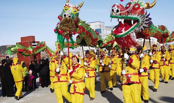耍龍?jiān)谏降ぽ^為普遍,較出名的是山丹縣清泉鎮(zhèn)西街村和東樂(lè)鄉(xiāng)城西村的耍龍。西街村民國(guó)年間的龍骨架現(xiàn)在仍保存完好,其的特點(diǎn)在于體積比較大,總長(zhǎng)近五十米,龍頭重62斤 ,龍身或48節(jié) ,或36節(jié) ,均為12的倍數(shù),閏年加1 節(jié),參與人數(shù)眾多,龍的整體色調(diào)為藍(lán)色調(diào),俗稱(chēng)“水龍。 ” 耍龍?jiān)诿磕甑呐D月三十開(kāi)始,二月二結(jié)束,歷時(shí)一月有余,正月十五達(dá)到高潮。西街村耍龍還有一定的講究,五行相克不耍,耍三年,停三年。每年臘月三十大龍耍到南湖取水,龍頭吊兩個(gè)水瓶用來(lái)裝水,預(yù)示來(lái)年風(fēng)調(diào)雨順、五谷豐登。耍龍時(shí)當(dāng)?shù)匕傩沼斜е『@龍身的習(xí)俗,認(rèn)為“鉆了龍身小孩的毛病少了,健康活潑”,這一習(xí)俗也流傳至今。耍龍的整個(gè)場(chǎng)面非常宏大,場(chǎng)地面積近一個(gè)足球場(chǎng)大小,但參與耍龍的演職人員近百人,分為六個(gè)步驟:總盤(pán)場(chǎng)、祭拜四門(mén)(東、西、南、北)、龍抱柱、鴛鴦八卦陣、龍睡覺(jué)、龍抱蛋。最壯觀(guān)是在晚上,整個(gè)龍身燈火透亮,龍嘴噴火,在夜間表演有強(qiáng)烈的藝術(shù)效果。在整個(gè)春節(jié)期間沿街商鋪,新建住宅有一定經(jīng)濟(jì)實(shí)力的人家都要請(qǐng)到自家耍,寓意保平安,祝發(fā)財(cái)。西街水龍與東樂(lè)火龍是不相見(jiàn)的,因?yàn)樗鸩蝗冢瑬|樂(lè)的龍只能在當(dāng)?shù)厮#话闱闆r不進(jìn)縣城。 2011年 ,山丹耍龍被甘肅省人民政府列入第三批省級(jí)非物質(zhì)文化遺產(chǎn)保護(hù)名錄。