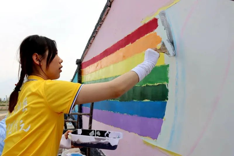 “本次繪畫結(jié)合當(dāng)?shù)剞r(nóng)家樂特色,融入田園風(fēng)光,鄉(xiāng)村童趣、航天科技等元素進行墻面彩繪,希望通過這次社會實踐活動,進一步提高專業(yè)能力水平,為鄉(xiāng)村振興貢獻青春力量?!备拭C政法大學(xué)藝術(shù)學(xué)院暑期社會實踐小分隊隊員辛翔說。