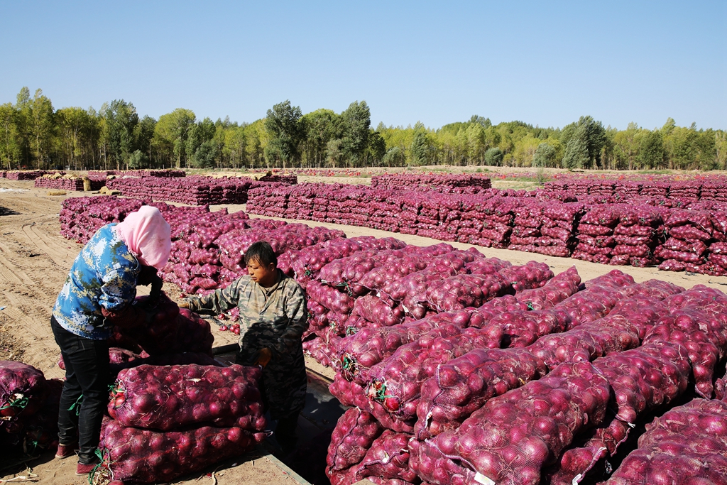 金秋時節(jié),張掖市臨澤縣鴨暖鎮(zhèn)昭武村的洋蔥喜獲豐收,村民們正在忙碌著裝袋轉(zhuǎn)運,銷往各地市場。該村通過土地流轉(zhuǎn),建成高標準洋蔥種植基地700多畝,由專業(yè)合作社實行訂單種植方式,畝產(chǎn)達到8噸左右,每噸價格達1400多元,有效保障了農(nóng)戶收益,實現(xiàn)了增收致富目標。