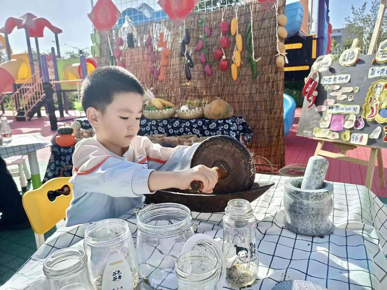 活動中,家長和小朋友們一同參加親子游戲、制作美食,孩子們在探究中認知秋日豐收的蔬果,在游戲中體驗秋季豐收的喜悅。小朋友們和爸爸媽媽共同制作的美味番茄醬,讓家長們再次感受到了熟悉的“童年味道”;親子美味泡菜、DIY罐頭制作中,孩子們在動手實踐中真切感受了“秋收冬藏”的意義;在土豆大作戰、“玉”你相遇、向前“蔥”的親子運動里,小朋友們和家長們在跑、跳、鉆、爬等親子游戲中樂享運動;在曬秋場和石磨坊中,小朋友們收集、認識稻谷、高粱等城市生活中難得一見的谷類,在游戲中獲得經驗、感受快樂。家長和孩子們仿佛置身于秋天的“雜貨鋪”里共享歡樂、守望成長。
