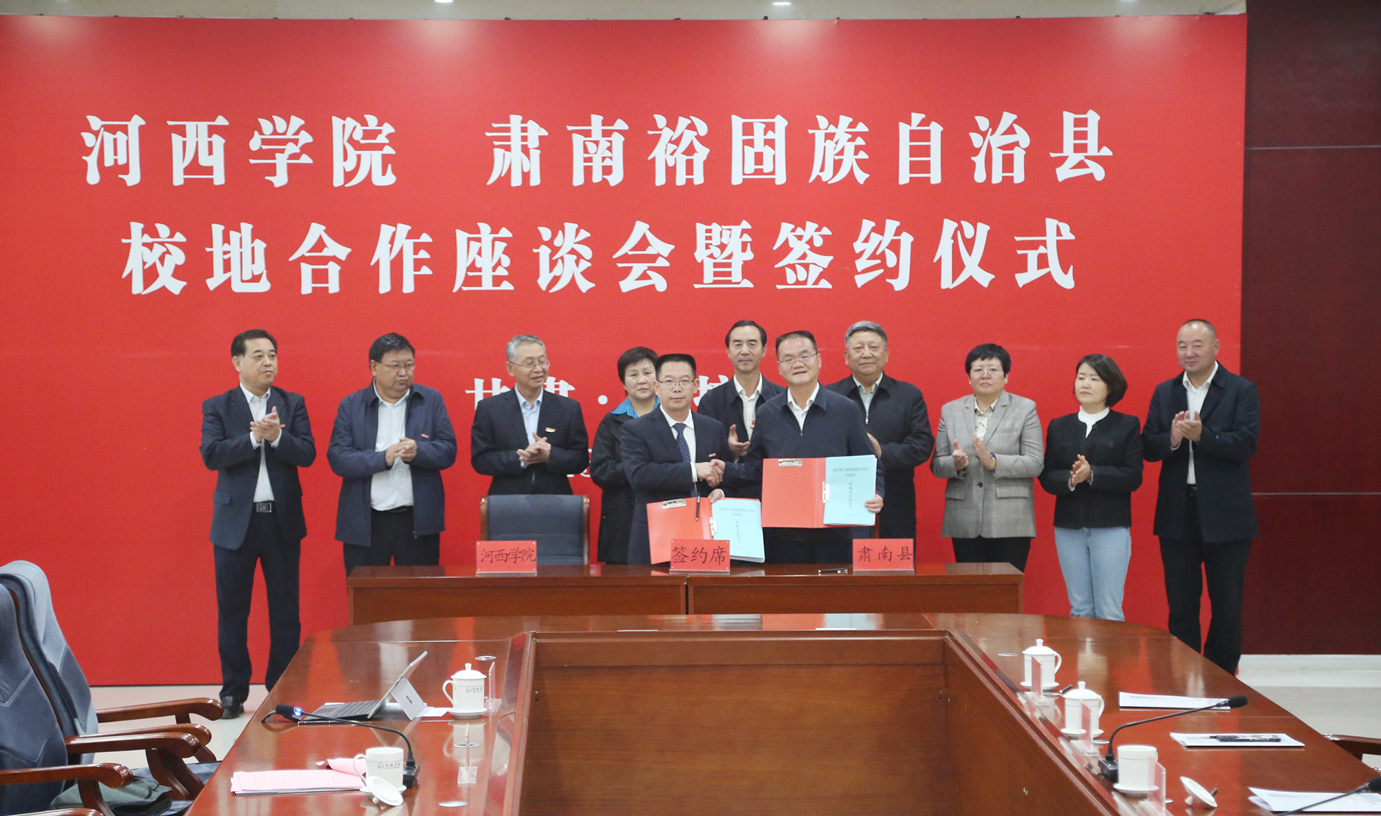 周勇和陸思東代表雙方簽署了《河西學院與肅南裕固族自治縣人民政府校地合作協議書》。