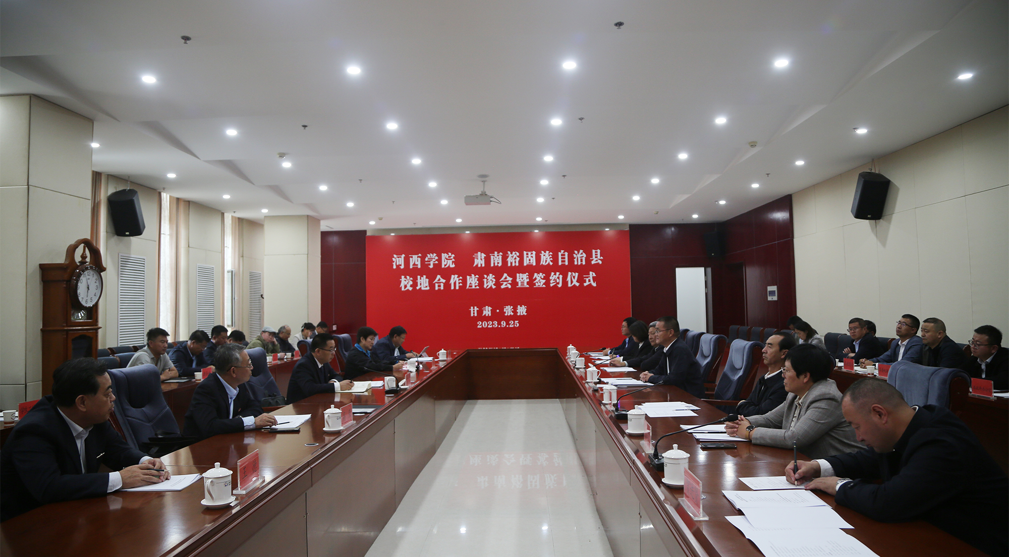 中國張掖網訊 9月25日,河西學院--肅南裕固族自治縣校地合作座談會暨簽約儀式在河西學院舉行,雙方就助力肅南縣各民族共同富裕先行區建設進行商議對接,開啟校地合作新篇章。肅南縣委書記陸思東、縣人大常委會主任丑生榮、縣政協主席蘭永武,縣四班子分管領導;河西學院黨委副書記、校長周勇,黨委常委、副校長、組織部部長高榮,黨委常委、副校長、教務處處長趙柱,黨委常委、附屬醫院黨委書記王德出席,黨委副書記強梅主持座談會。