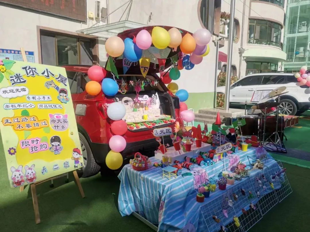 活動現場,由汽車尾箱裝飾的集市五花八門,“花點時間小鋪”“一碗水果撈”“嘻哈氣球”“淘書吧”“甜心鋪”“時光果汁店”“發飾小鋪”哆啦A夢的大口袋”等琳瑯滿目,玩具、飾品、鮮花、書籍、手工創意作品等讓孩子們目不暇接,水果撈、棉花糖、蛋撻、果汁等小食品小飲品DIY制作,不僅勾住了孩子們的眼睛,紛紛拿錢去買或拿物置換,也吸引得孩子們躍躍欲試。
