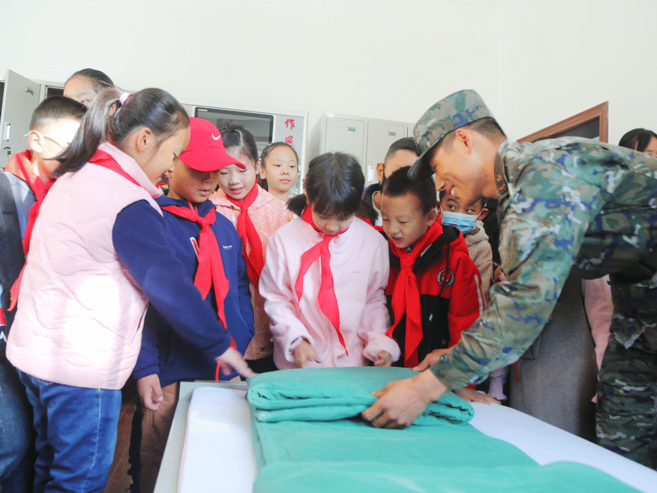 首先,少先隊員們來到了官兵宿舍,看著干凈整潔的環境,整齊劃一的物品擺放,棱角分明的“豆腐塊”,讓孩子們對軍人嚴謹的作風肅然起敬。官兵現場邊示范疊“豆腐塊”邊講解要領,引得孩子們躍躍欲試。