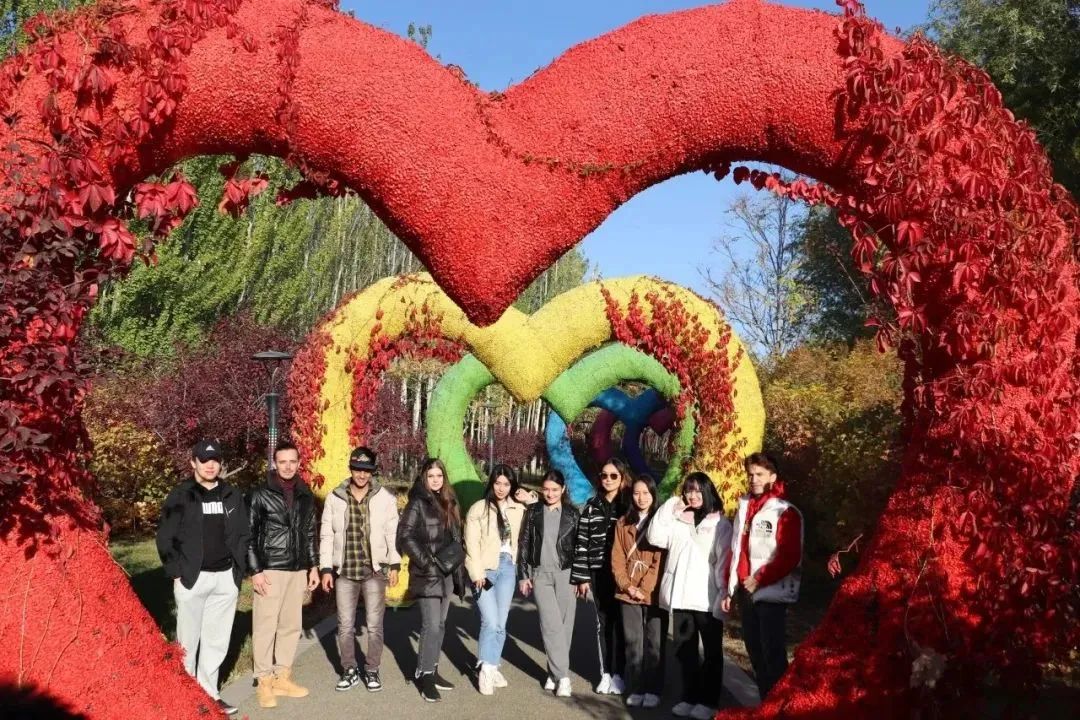 金秋時節(jié),研學團青年留學生們漫步在張掖蘆水灣旅游度假區(qū),樹木蔥郁,波濤微瀾,萬壽菊、馬鞭草、百日草等各色花卉競相綻放,蜿蜒的步道上游客漫步休閑,湖水澄明如鏡,水鳥在蘆葦叢旁翩躚嬉戲,與遠處巍峨的祁連群峰相映成趣,構成了一幅美麗的生態(tài)畫卷。