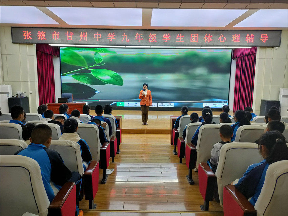 中國張掖網甘州訊 10月30日,甘州中學在學術報告廳開展了“奮斗的青春最美麗”九年級學生心理團輔活動。活動由國家二級心理咨詢師劉玉玲老師主講,全體九年級師生560人參與了本次活動。
