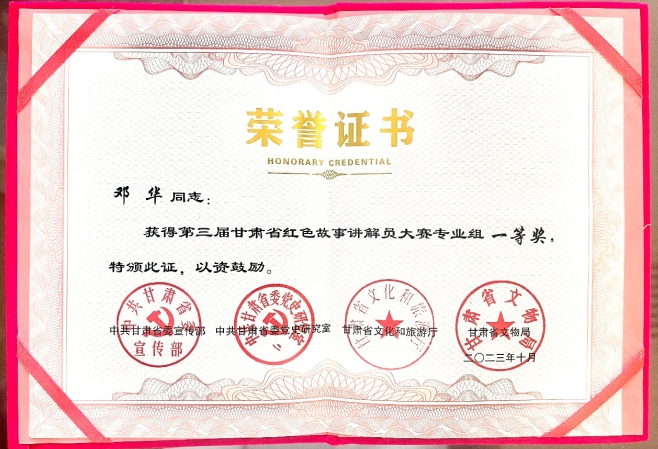 中國(guó)張掖網(wǎng)高臺(tái)訊 近日,由中共甘肅省委宣傳部、甘肅省委黨史研究室、甘肅省文化和旅游廳、甘肅省文物局共同舉辦的第三屆甘肅省紅色故事講解員大賽暨第四屆全國(guó)紅色故事講解員大賽甘肅賽區(qū)選拔賽在蘭州圓滿落幕。中國(guó)工農(nóng)紅軍西路軍紀(jì)念館推選的講解員鄧華在比賽中獲得專業(yè)組一等獎(jiǎng)。