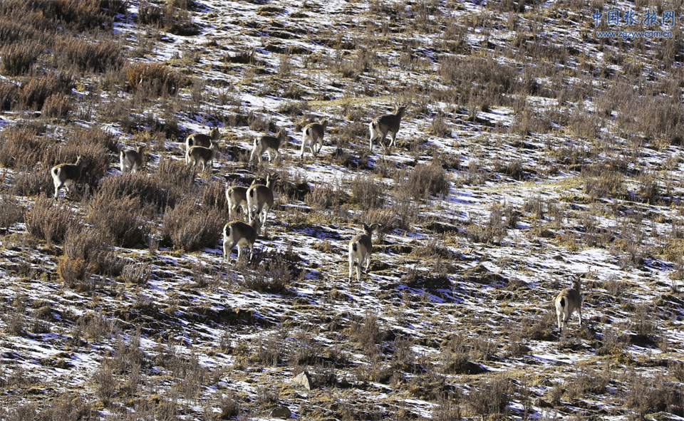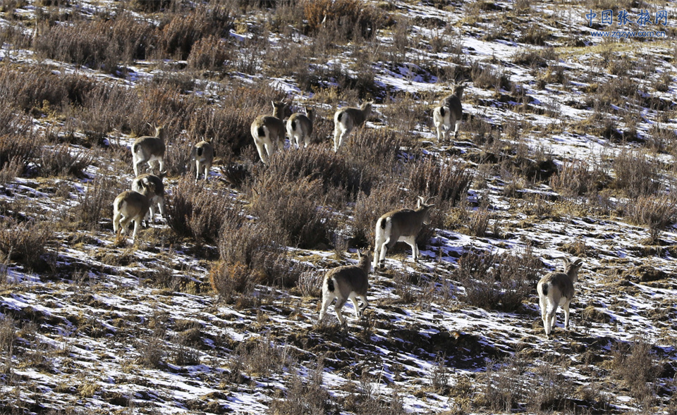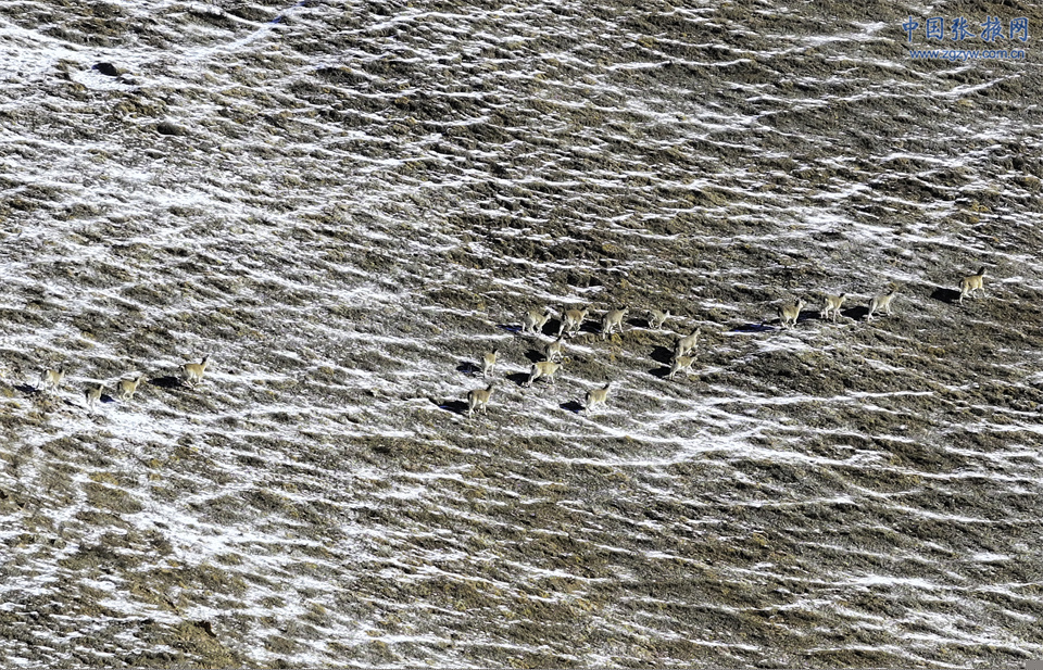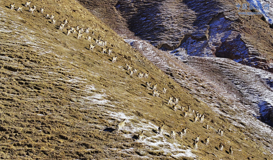中國張掖網民樂訊 11月16日,張掖市民樂縣公安局森林警察大隊民警在海拔2800米的扁都口林區利用無人機巡護時,拍到一大群巖羊在雪地覓食、奔跑的珍貴畫面。數量達200只左右,場景壯觀。