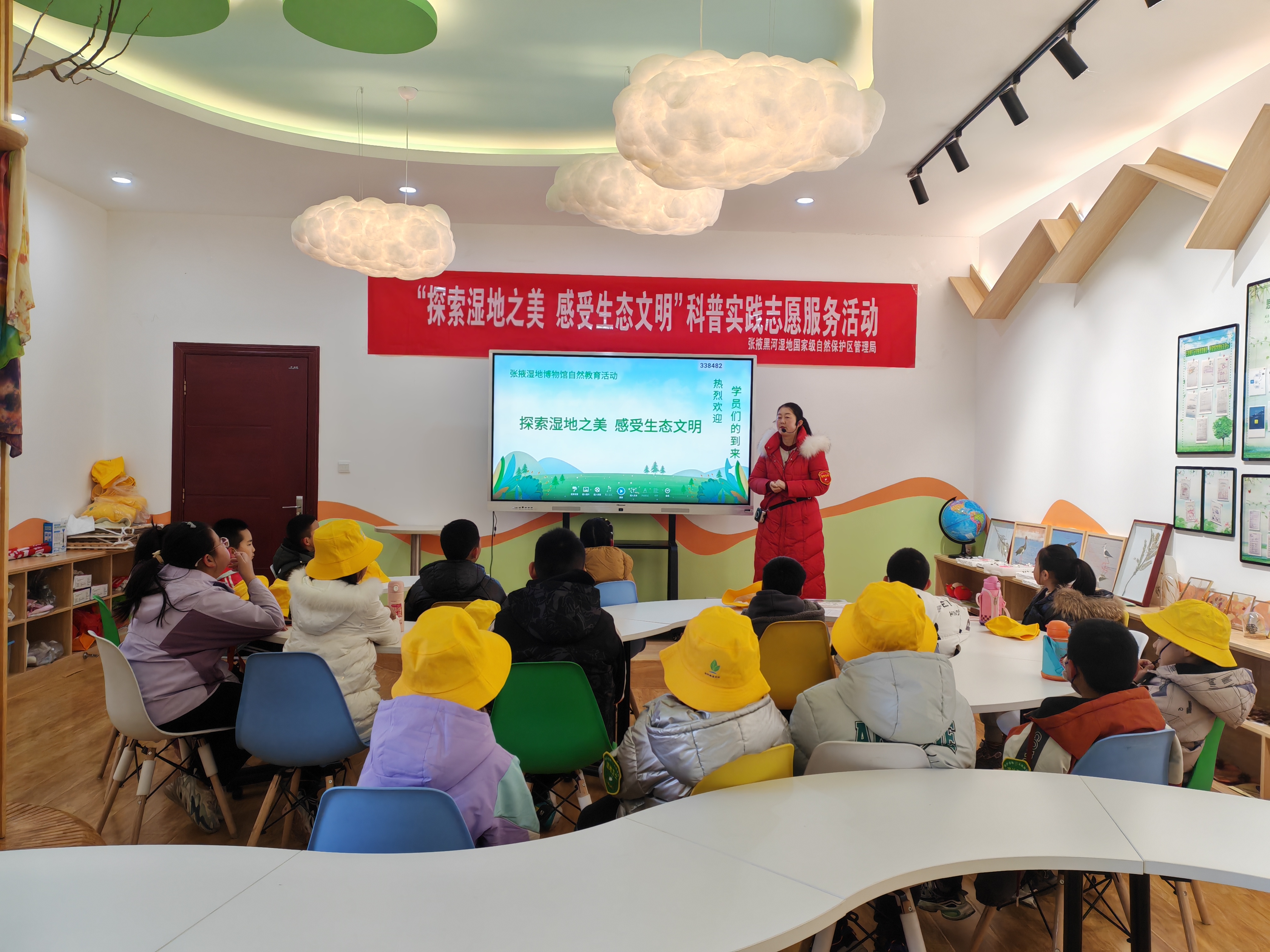 張掖濕地博物館位于張掖國家濕地公園內,距離張掖市中心不到3km,是全市唯一一個以濕地為主題的科普展館。展館建筑面積5571㎡,室內布展5000㎡,設有6個展廳,是張掖黑河濕地的科普場地、綠色發展的展示平臺、自然教育的宣教課堂。展廳內通過濕地場景復原、多媒體互動和圖文展示等多種方式充分展現濕地之美。學員們身處逼真的濕地生態系統中大開眼界,既學習了濕地知識,又激發了他們對濕地生態環境的關注和熱愛。