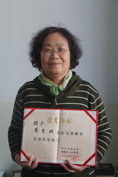 高愛玲,女,1952年4月出生,1969年參加工作,一直從事糧食保管工作。不論在哪個工作崗位上,她都任勞任怨,盡職盡責。為了不使糧食受損,她不分白天黑夜,隨叫隨到為倉庫糧食鋪蓋篷布。負責保管的糧食賬簿記載清楚,日清月結。糧食保管嚴格按照規范要求,按制度規定勤檢查,從未出現霉變、生蟲、短少等問題。她還熱情的為交糧農戶服務,積極搭栓畜棚,想方設法方便群眾交糧,深受群眾的好評。因其工作成績突出,表現優異,于1997年榮獲張掖市“勞動模范”榮譽稱號。