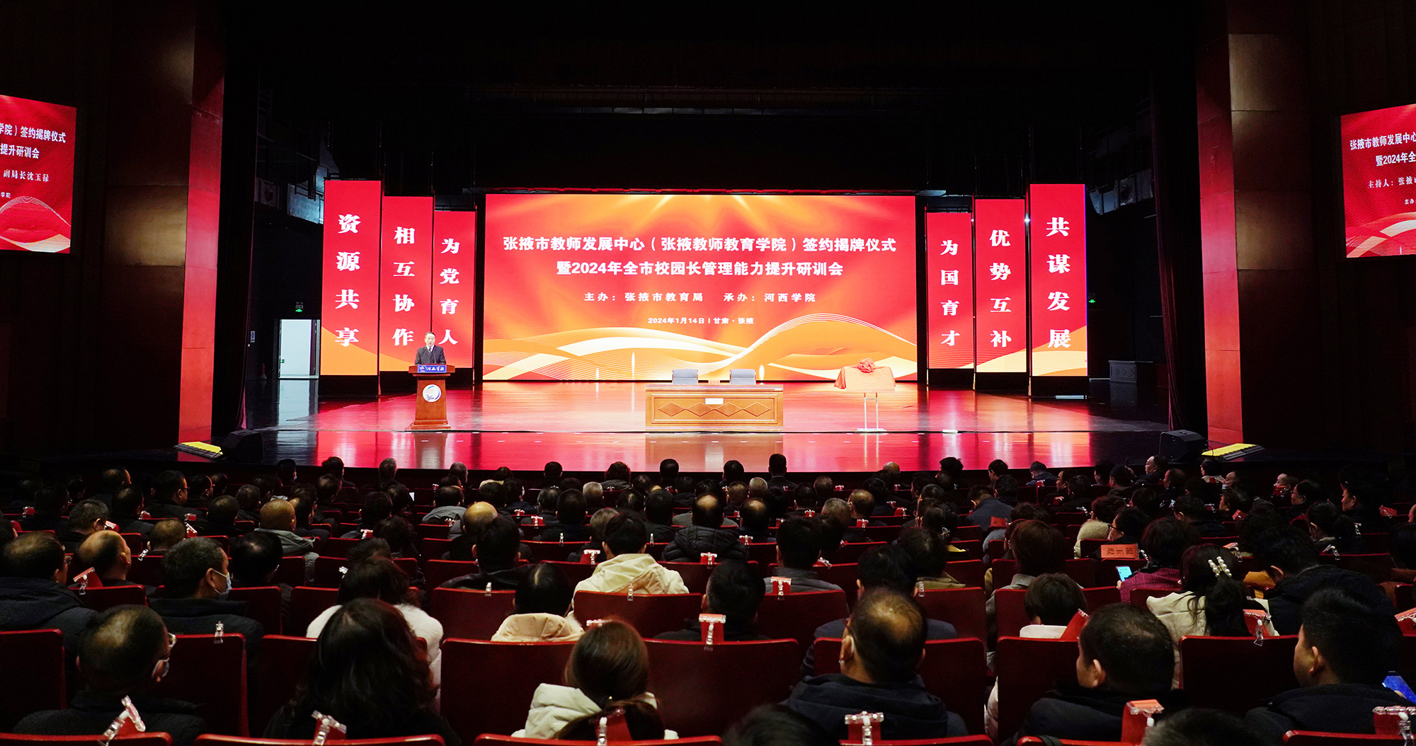 中國張掖網(wǎng)訊 1月14日,張掖市教師發(fā)展中心(張掖教師教育學(xué)院)簽約揭牌儀式暨2024年全市校園長管理能力提升研訓(xùn)班在河西學(xué)院河西講堂報(bào)告廳舉辦。河西學(xué)院黨委常委、副院長王新華、張掖市政府督察專員袁小龍出席,揭牌儀式由張掖市教育局黨組成員、副局長沈玉祿主持。