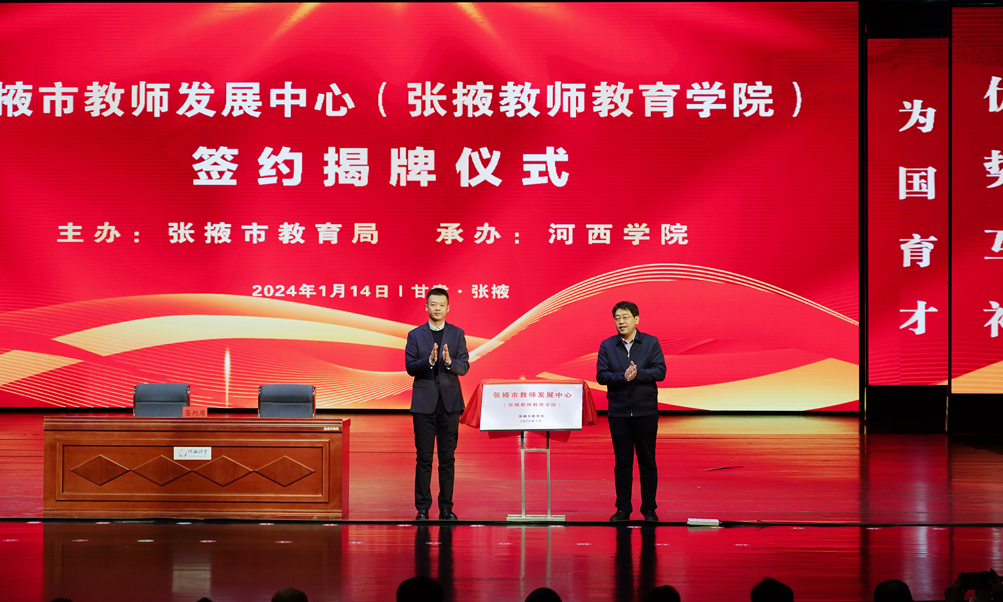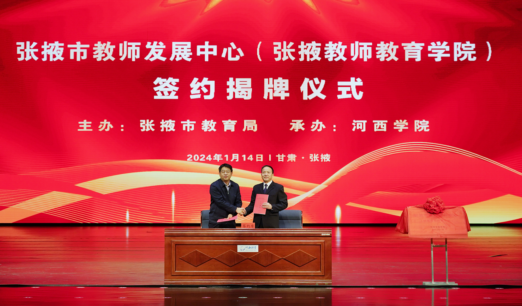 王新華代表河西學(xué)院致辭并介紹張掖市教師發(fā)展中心(張掖教師教育學(xué)院)基本情況,王新華與沈玉祿代表校地雙方簽約,王新華與袁小龍共同為張掖市教師發(fā)展中心(張掖教師教育學(xué)院)揭牌。