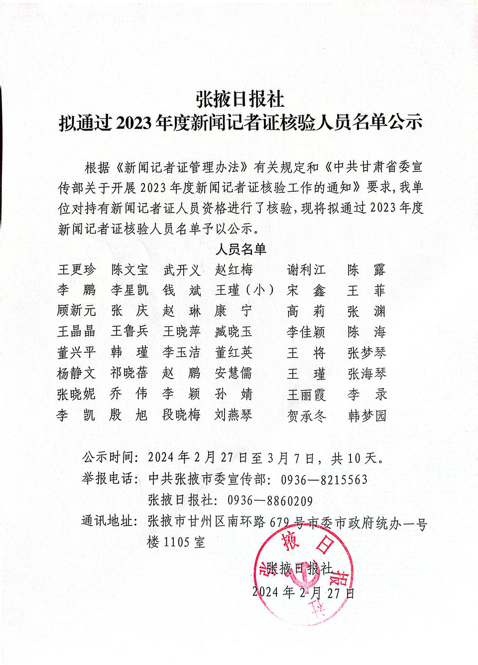 您當前的位置 : 中國張掖網 >> 問政 >> 公告 張掖日報社擬通過2023年度新聞記者證核驗人員名單公示 來源:中國張掖網 0 人參與互動 2024年02月27日 10:35