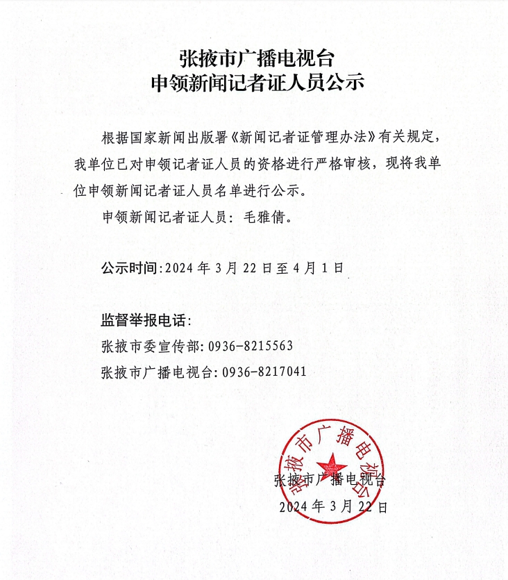 您當前的位置 : 中國張掖網(wǎng) >> 問政 >> 公告 張掖市廣播電視臺申領(lǐng)新聞記者證人員公示 來源:張掖市融媒體中心 0 人參與互動 2024年03月22日 09:52