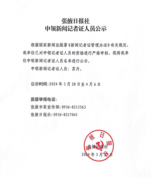 張掖日報社擬通過2023年度新聞記者證核驗人員名單公示