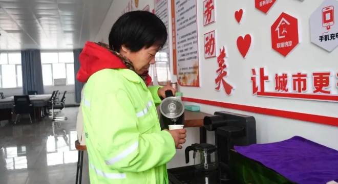 走進位于山丹縣清泉鎮世博社區黨群服務中心一層的戶外勞動者愛心驛站,桌椅、飲水機、冷暖設備、應急藥箱、多功能充電器等設施一應俱全。幾名戶外勞動者在這里喝著熱水,嘮著家常,緩解一上午工作的疲累。忙碌了大半天的外賣小哥鄭強飛,來到世博社區“愛心驛站”的入口處給電動車充電,順便給手機充充電等待下一單。鄭強飛說:“天氣逐漸熱起來了,能夠在愛心驛站里喝水、乘乘涼、歇歇腳,我們感覺很暖心。”