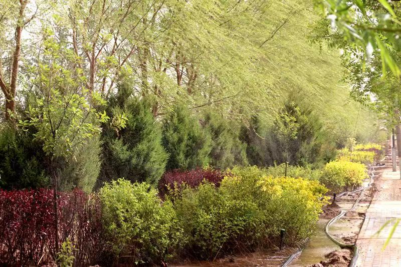 在黑河大橋植樹帶兩側,金葉榆、紫葉矮櫻、白蠟等七彩飄帶灌木叢扮靚了出入口風景線,一個個噴灌設施“自由揮舞”滋潤著剛剛新栽植的樹木,在喝足“生命水”后,一顆顆苗木煥發生機、努力生長。同時,五一前后,各村也緊抓樹木生長黃金時間,安排專人對新栽植和補植補造的苗木、樹木進行加溝、灌水、培土,確保每一株、每一棵樹木“喝”到充足的水量,有效避免因高溫、缺水等原因引起的苗木干枯。