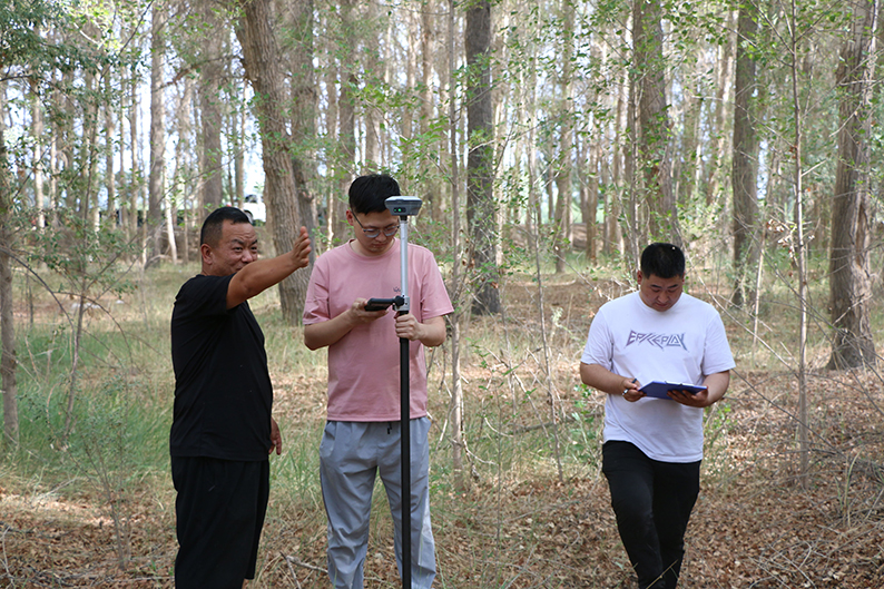勘測現場正在帶隊進行實地勘測的張掖市指南針測繪有限責任公司總經理許棟為了保證數據的精度,運用了多種手段,他說:“為了保證數據的精度,我們以航拍信息為依據,通過衛星定位、人工測繪等方式進行地籍勘測,查清承包地塊實際面積、四至邊界和空間位置,最終實現每塊土地都有一個數據準確的坐標。”作為推動集體林權制度改革具體工作的一員,臨澤縣自然資源局干部閆天虎說:“2009年集體林權改革時,分林到戶的林地存在面積不準、地類重疊、界線不清等問題,通過深化集體林權制度改革,理清了以上歷史遺留問題,解決了林地就是林地,耕地就是耕地,草地就是草地的根本問題。”